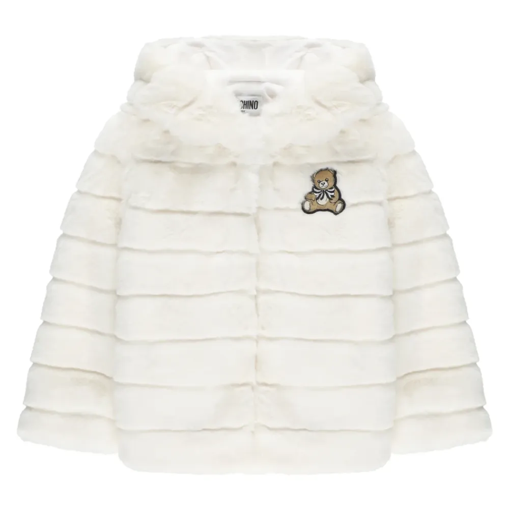 Bleiben Sie warm und stilvoll mit diesem Ivory Moschino Baby Sweatshirt aus synthetischem Pelz für Mädchen. Mit Kapuze, langen Ärmeln, vorne kontrastierendem farbigen gestickten Logo und vorderer Knopfleiste. Perfekt für die Wintersaison!