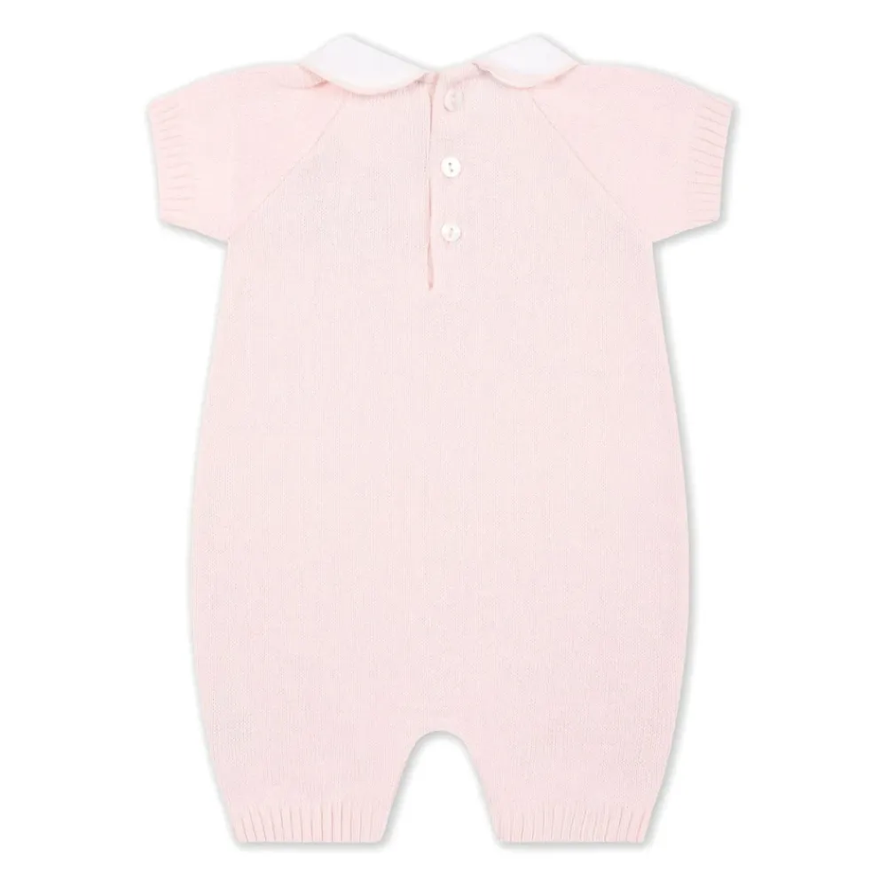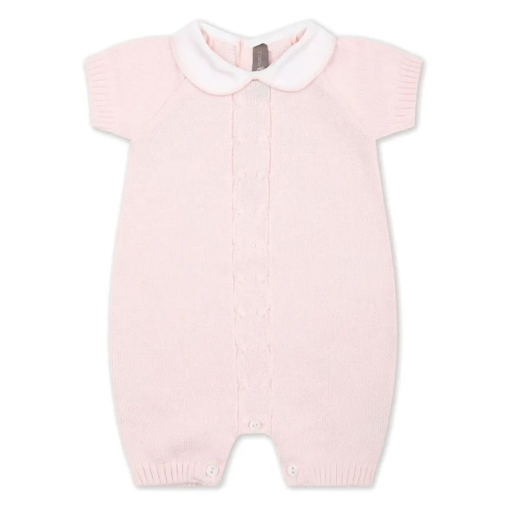 Kleide dein Kleines stilvoll in diesem entzückenden Little Bear hellrosa Baumwollstrampler. Hergestellt aus feinem Strick mit Zopfmuster, verfügt er über einen bezaubernden Peter Pan-Kragen, kurze Ärmel, hinten Knopfverschluss und gerippte Abschlüsse für einen niedlichen und bequemen Look.