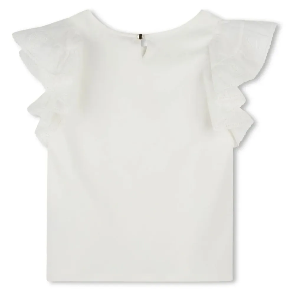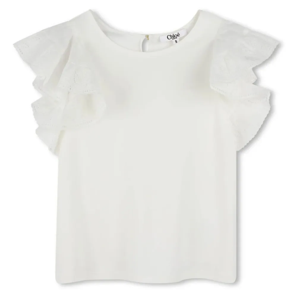 Die Chloé Bluse mit Rüschenärmeln verkörpert einen schicken und lässigen Stil mit eleganten Rüschendetails und einem gestickten Logo, wodurch sie sich perfekt für vielseitige Outfits eignet. Wichtige Merkmale: Weiß | Baumwolle | Einzelner Knopfverschluss hinten | Rüschendetails | Gesticktes Logo | Kurze Ärmel | Rundhalsausschnitt | Zusammensetzung und Pflege: 100% Baumwolle | Maschinenwäsche kalt, Trocknergeeignet bei niedriger Temperatur