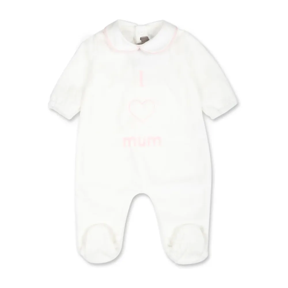 Kleiden Sie Ihr Kleines stilvoll in diesen weißen Chenille-Strampler von Little Bear. Mit langen Ärmeln, einem Peter Pan-Kragen mit rosa Profilen, Druckknopfverschluss auf der Rückseite und elastischen Füßen und Bündchen. Verziert mit einem Herz und der Stickerei ‚Mum‘ auf der Vorderseite. Hergestellt in Italien aus 80% Baumwolle und 20% Polyamid. Nur Handwäsche.