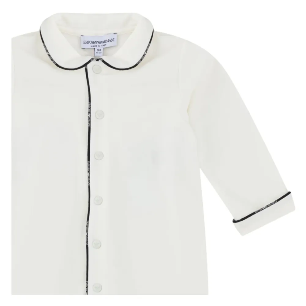 Emporio Armani Junior cremefarbener Body aus reinem Stretch-Baumwolljersey, verziert mit kontrastierender Logo-Borte, lange Ärmel, Peter Pan-Kragen, vorderer und unterer Öffnung. Zusammensetzung: 93% warme Baumwolle, 7% Elastan. Hergestellt in Italien.