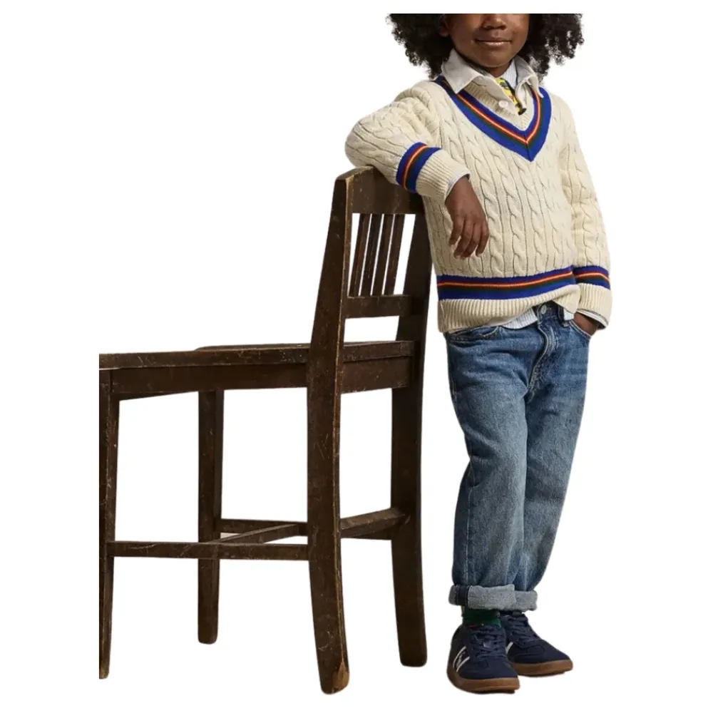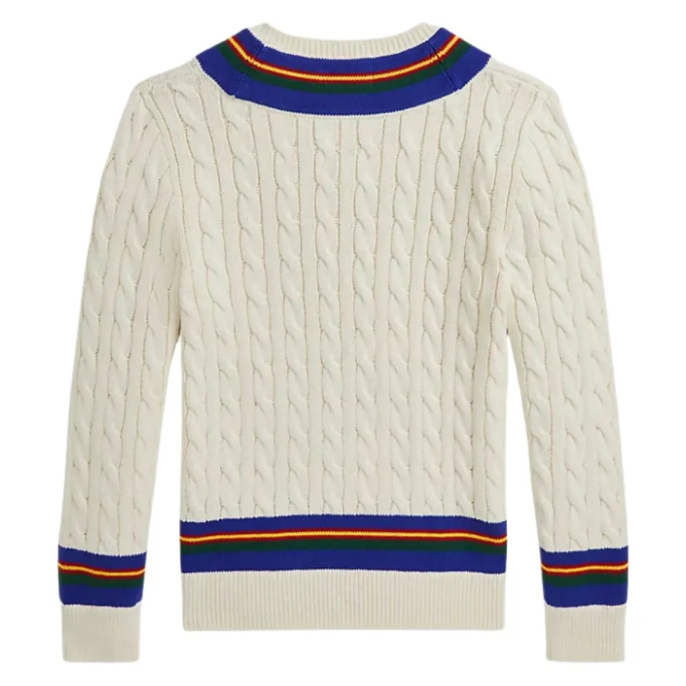 Das Ralph Lauren Cricket Jersey ist ein stilvoller, cremefarbener Pullover mit einem klassischen Zopfmuster. Perfekt, um jedem Outfit einen Hauch von Eleganz zu verleihen. Dieser Pullover hat einen V-Ausschnitt und lange Ärmel und ist ideal für kühlere Tage. Wichtige Merkmale: Creme | Beige | Baumwolle | V-Ausschnitt | Lange Ärmel | Kontrastierende blau/mehrfarbig gestreifte Kanten | Gerippte Bündchen | Zusammensetzung und Pflege: 100% Baumwolle