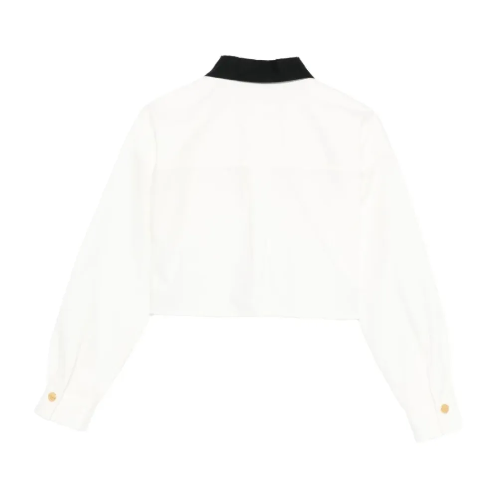Das Elisabetta Franchi Cropped-Shirt mit Schleifenknotenkragen vereint eine verkürzte Silhouette mit einem kontrastierenden Kragen und einer dekorativen Schleife, die durch goldfarbene Knöpfe für einen edlen Look akzentuiert wird. Hauptmerkmale: Weiß | Schwarz | Knopfleiste vorne | Schwarzer Kontrastkragen | Schleife am Ausschnitt | Goldfarbene Knöpfe | Lange Ärmel | Verkürzte Länge