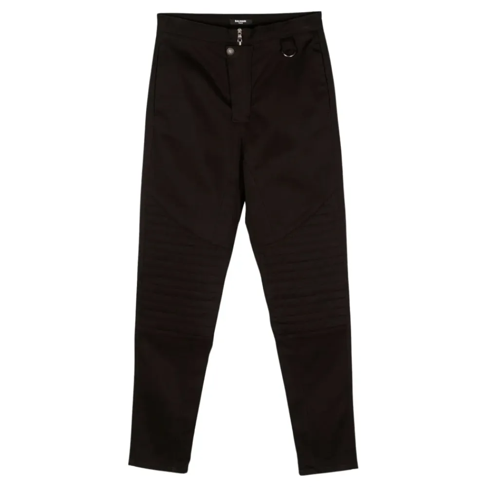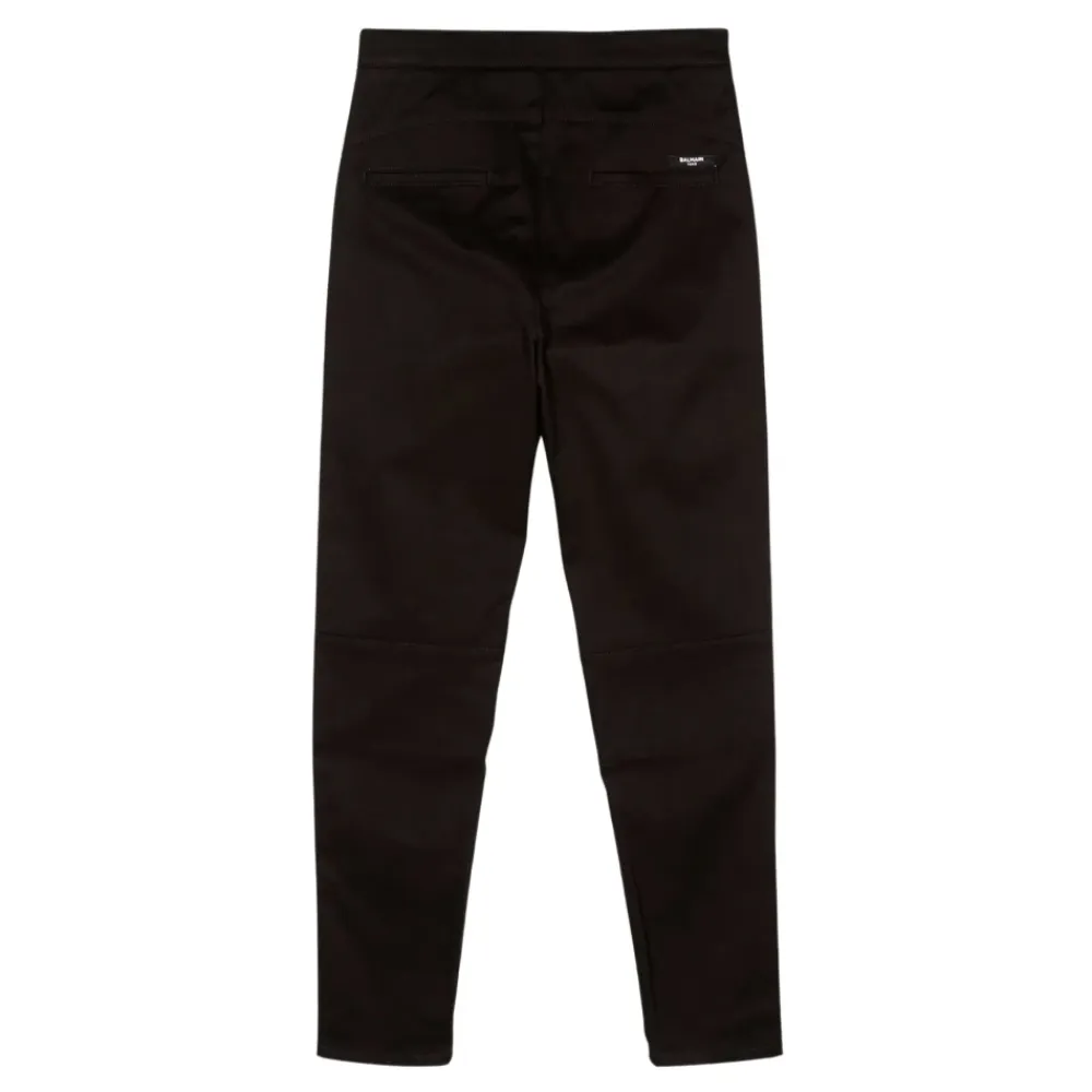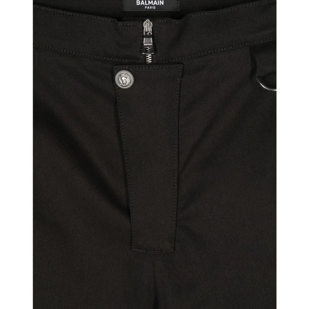 Die Balmain Delnero Hose kombiniert eine hoch taillierte, elastische Silhouette mit charakteristischen Knöpfen und silberfarbenen Ringbeschlägen für einen eleganten, smart-casual Look. Entworfen für stilvolles Alltagsoutfit und einfaches Styling. Wichtige Merkmale: Schwarz | Baumwolle | Reißverschluss | Knopfdekoration | Silberring-Detail | Logo hinten | Maße und Passform: Hoch tailliert | Stretch-Passform | Materialzusammensetzung und Pflege: 98% Baumwolle | 2% Elastan