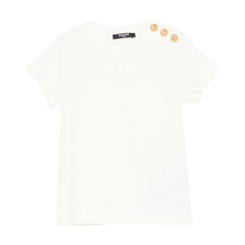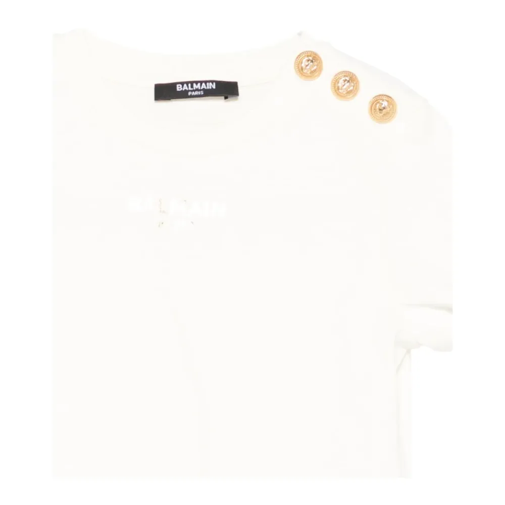 Das drapierte Balmain T-Shirt mit Knöpfen verfügt über Löwenkopfknopfdetails auf der Schulter und eine drapierte, figurbetonte Silhouette – ein raffiniertes Basic für gehobene Casual-Looks. Hauptmerkmale: Weiß | Baumwolle | Runder Halsausschnitt | Kurze Ärmel | Löwenkopfknopfdetail an der Schulter | Gesticktes Logo auf der Rückseite | Abmessungen & Passform: Lange, figurbetonte Silhouette | Zusammensetzung & Pflege: 100 % Baumwolle