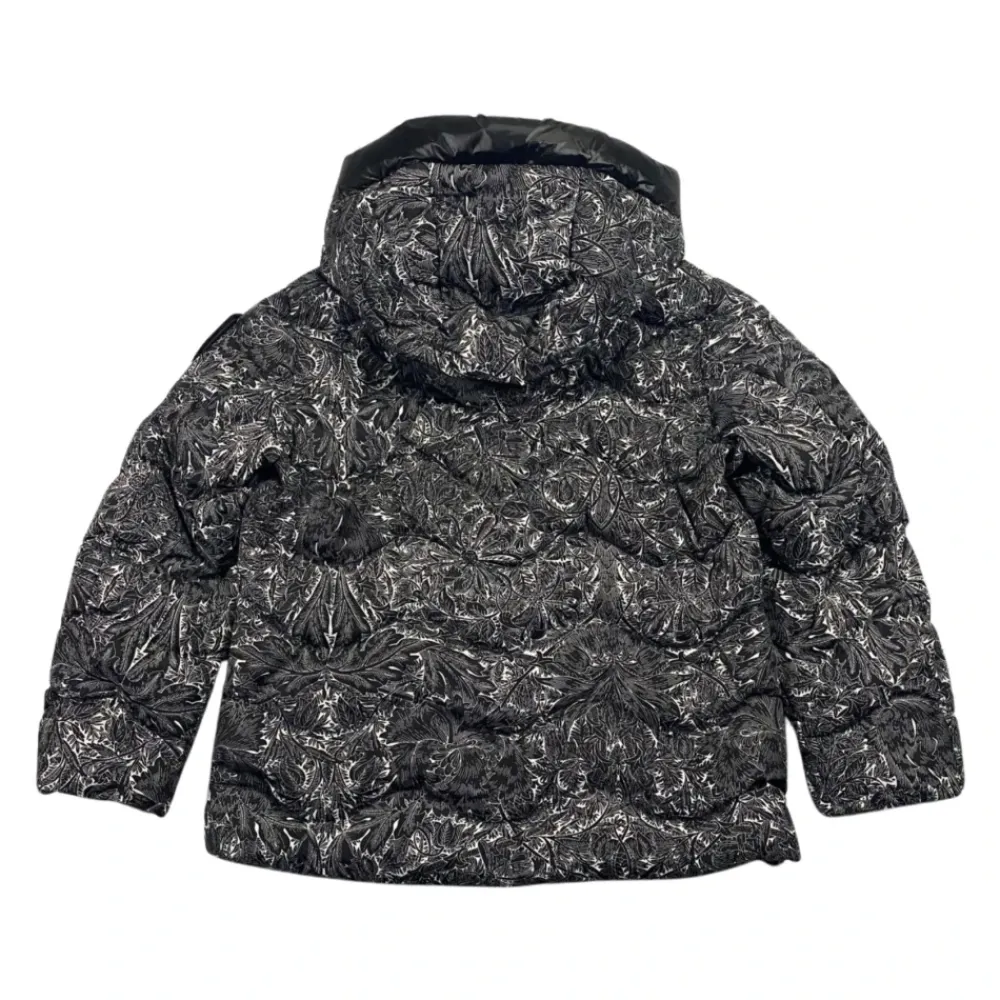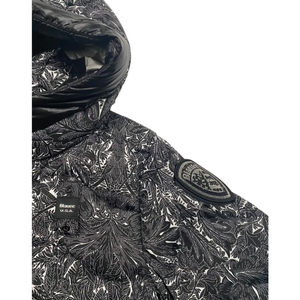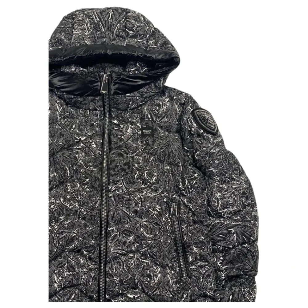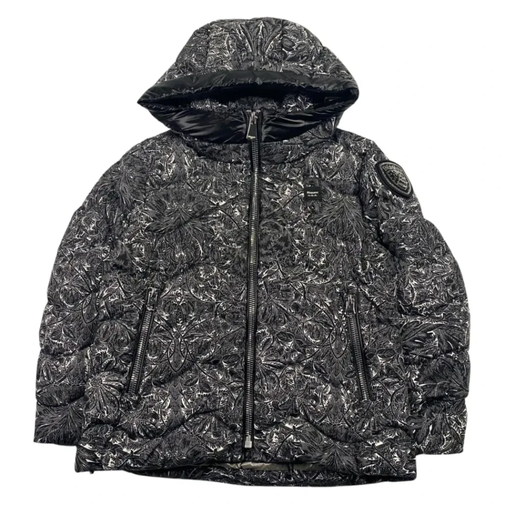 Blauer Kids Jacke im schwarz-weißen Blumenmuster, gestepptes Design, Frontreißverschluss, Logo-Patch auf der Brust, Glitzerlogo am Ärmel, zwei seitliche Reißverschlusstaschen. Außenmaterial: 100% Polyamid. Füllung: 90% weiße Entendaunen 10% weiße Entenfedern.