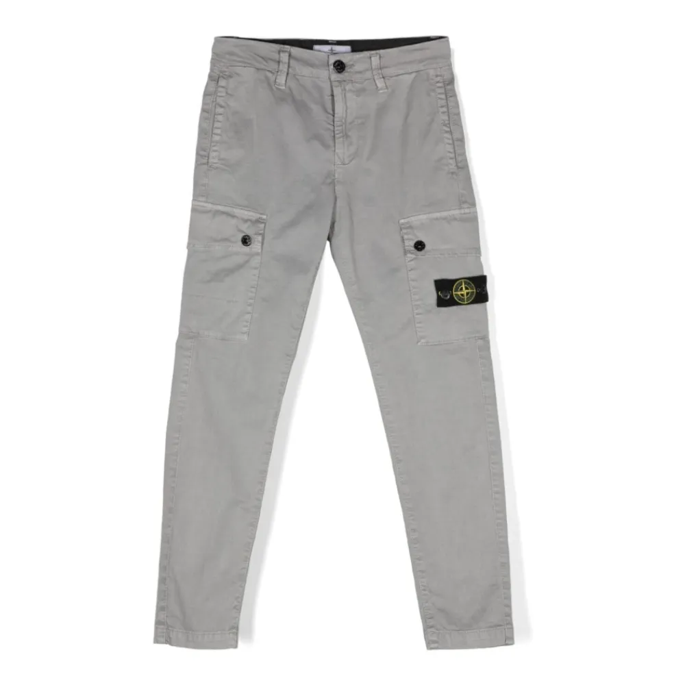 Stone Island Kids mittelgraue Stretch-Baumwollhose für Jungen. Mit Gürtelschlaufen, zwei seitlichen Einschubtaschen, zwei seitlichen Cargotaschen, hinterer Leistentasche, charakteristischem abnehmbarem Compass-Abzeichen, verdecktem Reißverschluss und Knopfverschluss.