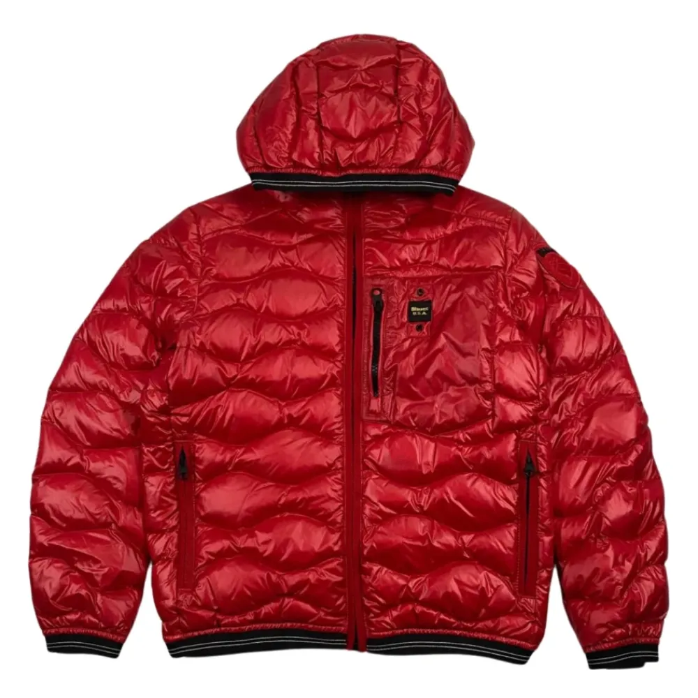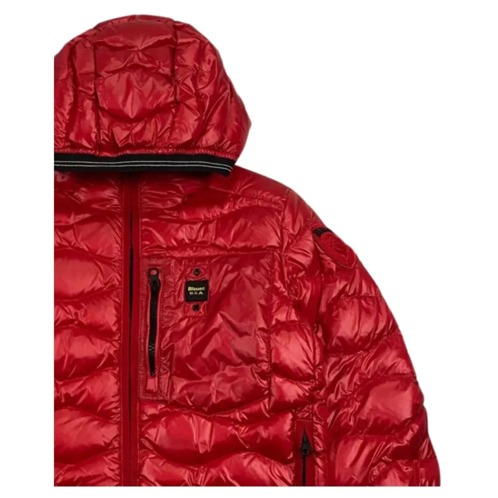 Blauer Kids rote Winterjacke mit gestepptem Design, Frontreißverschluss, Logo-Patch auf der Brust, Logo am Arm, schwarze kontrastierende elastische Säume, zwei seitliche Reißverschlusstaschen. Außenmaterial: 100% Polyamid. Füllung: 90% Entendaunen 10% Entenfedern.