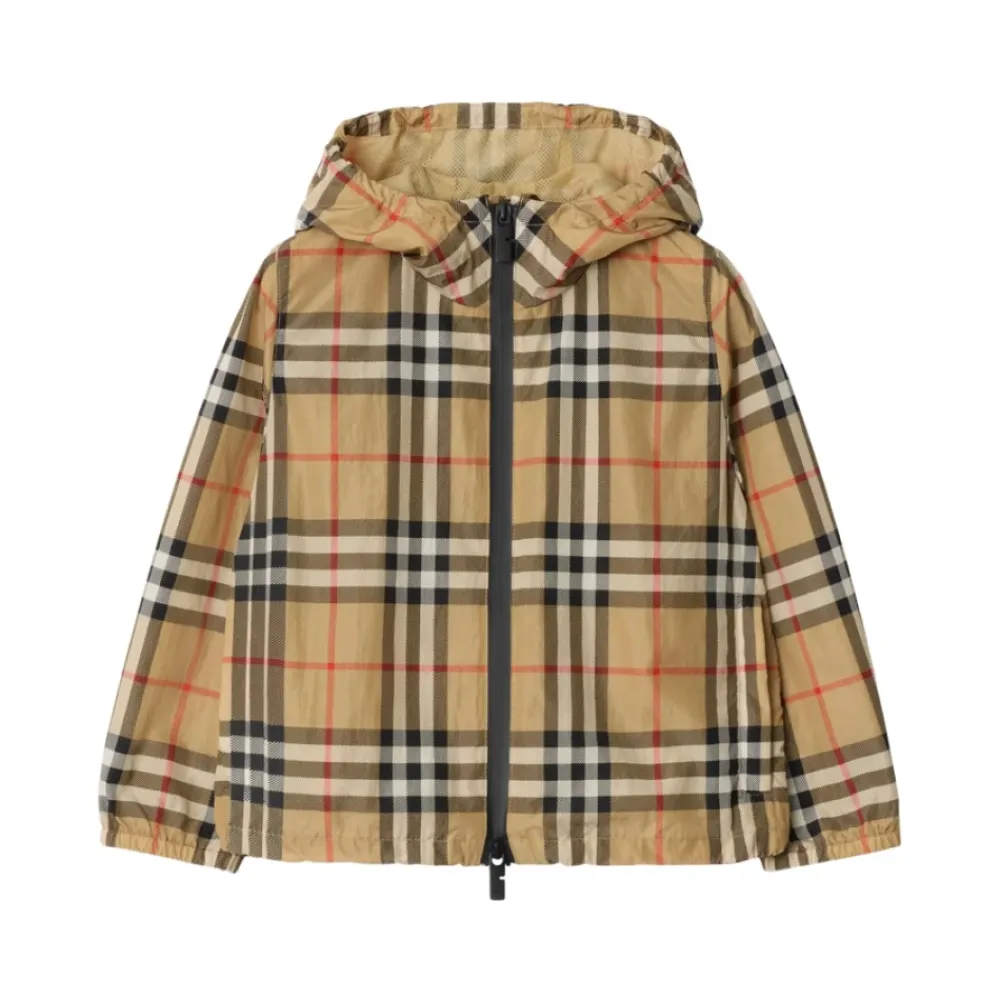 Burberry braune leichte Jacke mit charakteristischem Karomuster für Jungen mit Zwei-Wege-Reißverschluss und elastischen Bündchen.