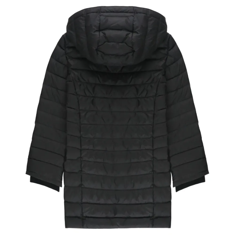 Bleiben Sie warm und stilvoll mit dieser schwarzen Burberry Kids Daunenjacke für Mädchen. Mit Kapuze mit Knöpfen, langen Ärmeln und einem kontrastierenden farbigen Logo-Patch am linken Ärmel. Diese Jacke verfügt auch über zwei seitliche Schlitztaschen und einen Frontreißverschluss.