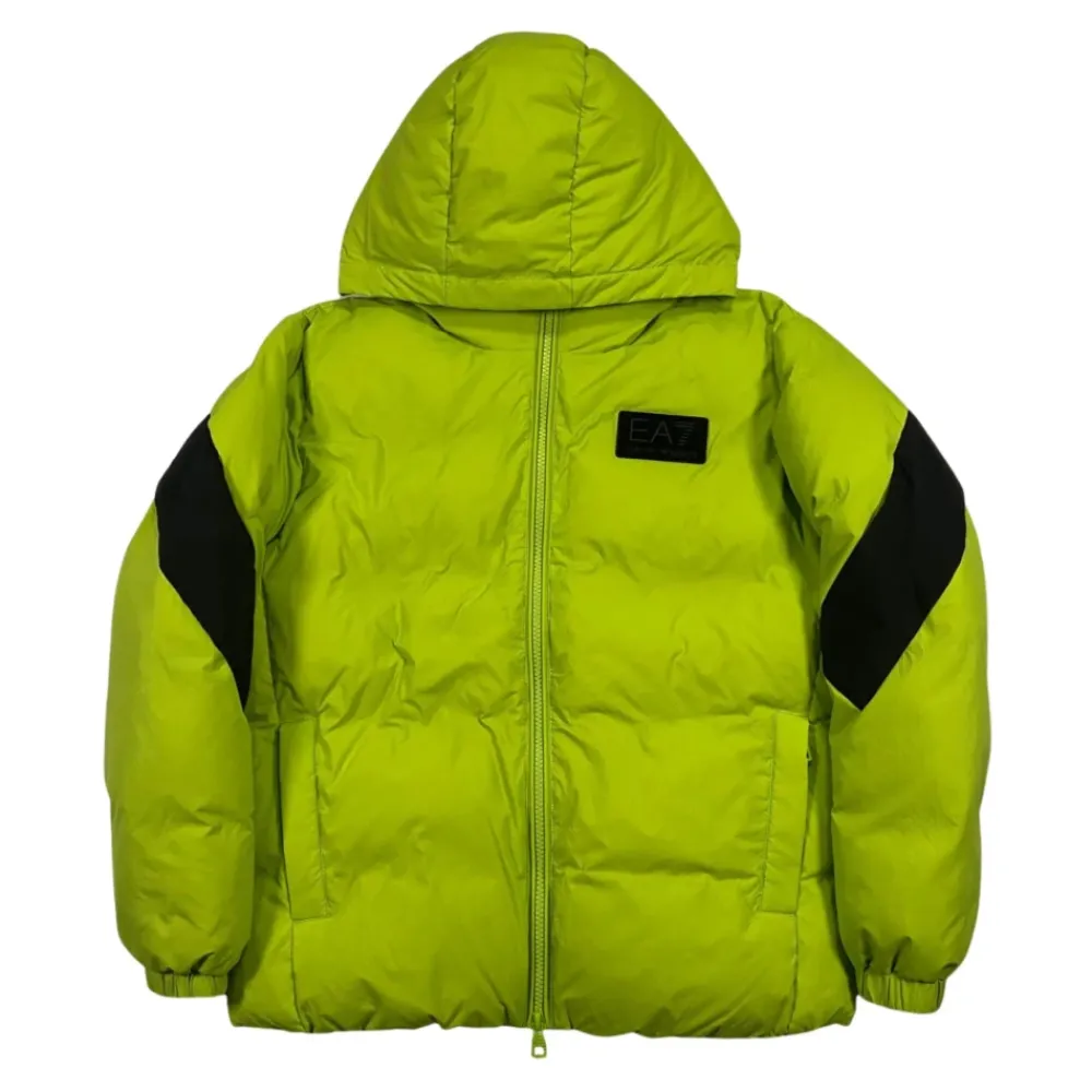 Emporio Armani Kids Fluogrüne Jacke mit schwarzen Kontrastdetails, Kapuzendesign, Logo-Applikation auf der Brust, zwei Seitentaschen, gerader Saum. Außenschale Zusammensetzung: 100% Polyamid. Füllung: 100% Polyester.