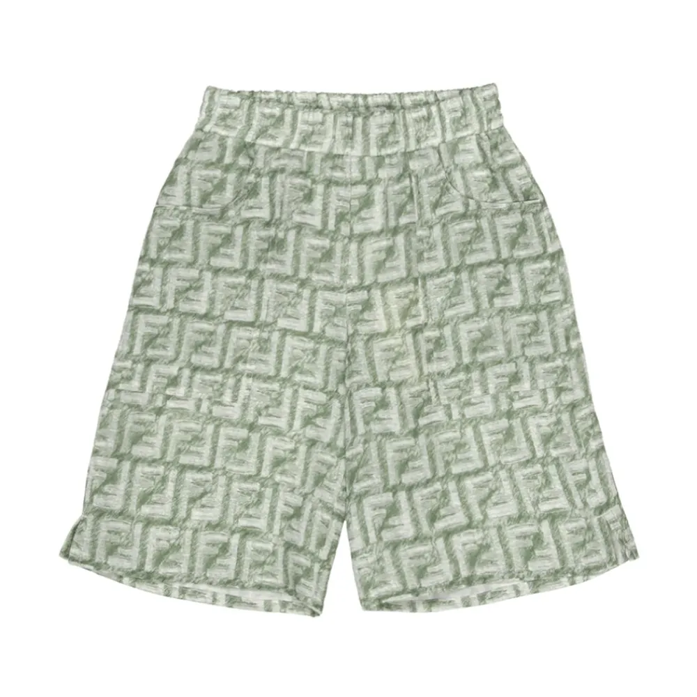 Fendi präsentiert die grüne Monogramm Leinen Shorts mit einem stilvollen Allover-FF-Motiv und einem bequemen elastischen Bund. Perfekt, um jeder Garderobe einen Hauch von Luxus zu verleihen. Wichtige Merkmale: Grün | Leinen | Elastischer Bund | Zwei Vordertaschen | Allover-FF-Motiv | Maße und Passform: Normale Passform |