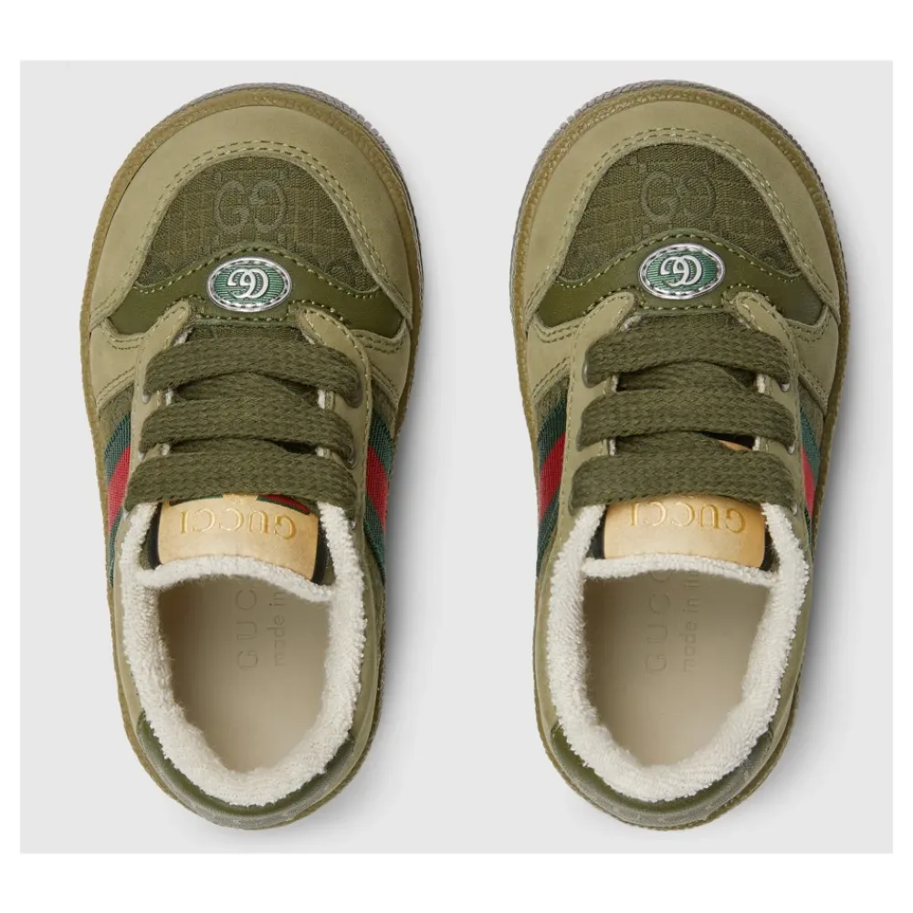 Heben Sie den Stil Ihres kleinen Jungen mit diesen Gucci-Sneakers in grünem Wildleder mit GG-Ripstop-Baumwolleinsätzen hervor, die eine grüne und rote Webstreifen aufweisen. Hergestellt in Italien mit akribischer Handwerkskunst, prahlen diese Sneakers mit einem emaillierten ovalen Detail mit Metall-Doppel-G, Vintage-Gucci-Logoschild, und einer zweifarbigen Sohle mit einer Absatzhöhe von 22 mm.