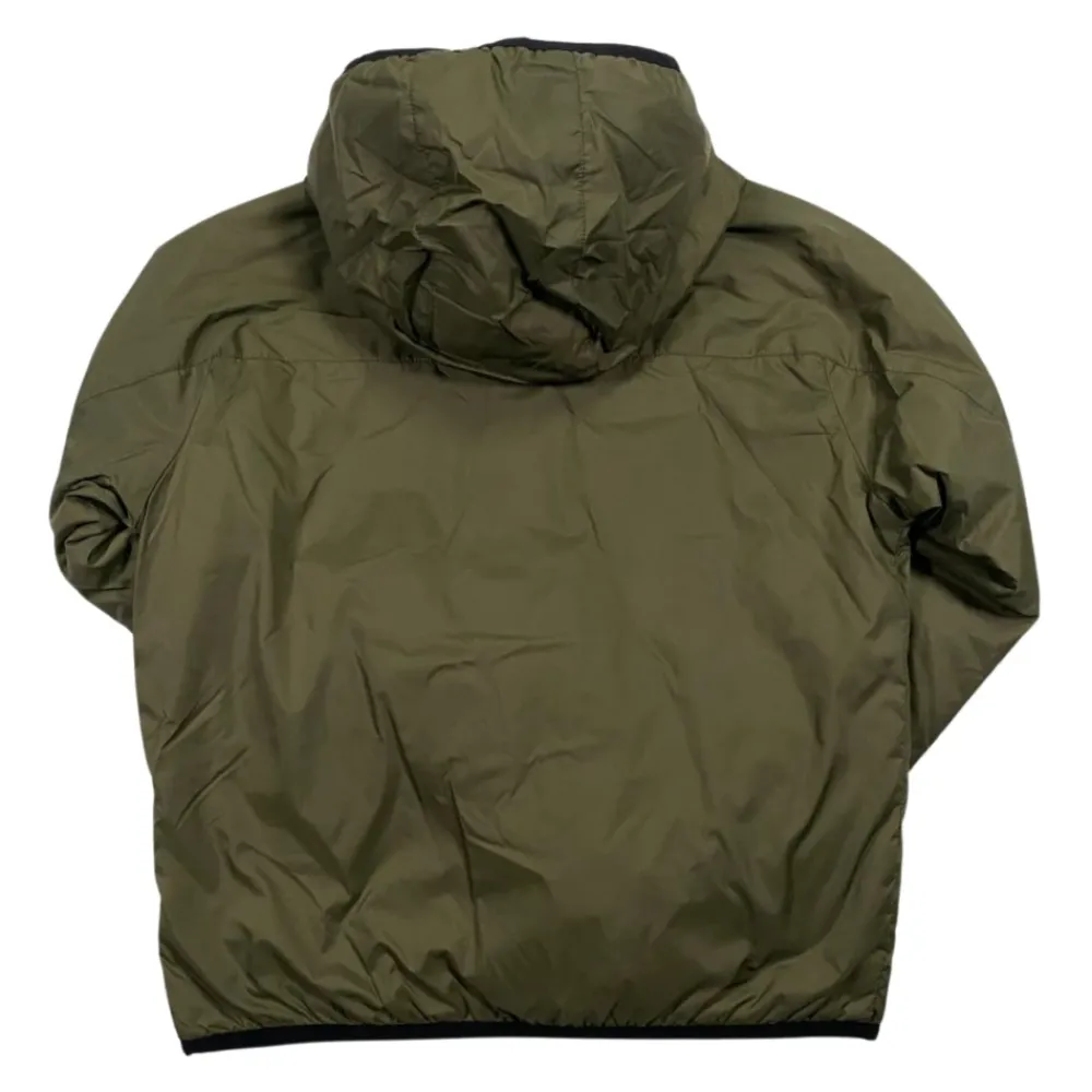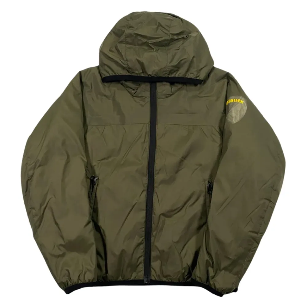 Blauer Kids grüne winddichte Jacke mit fester Kapuze, zentralem Reißverschluss, zwei Seitentaschen, Logodruck am Arm, schwarze kontrastelastische Bündchen, reguläre Passform. Zusammensetzung: 100% Polyamid.