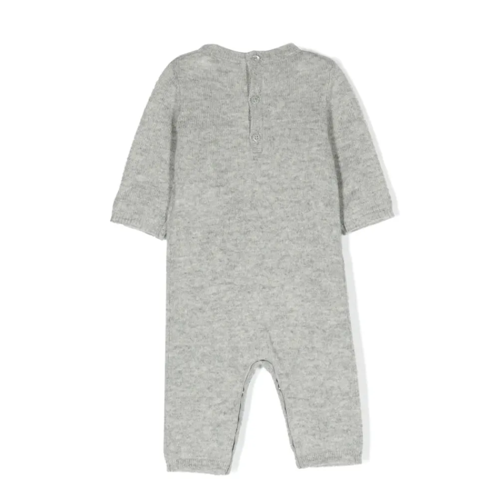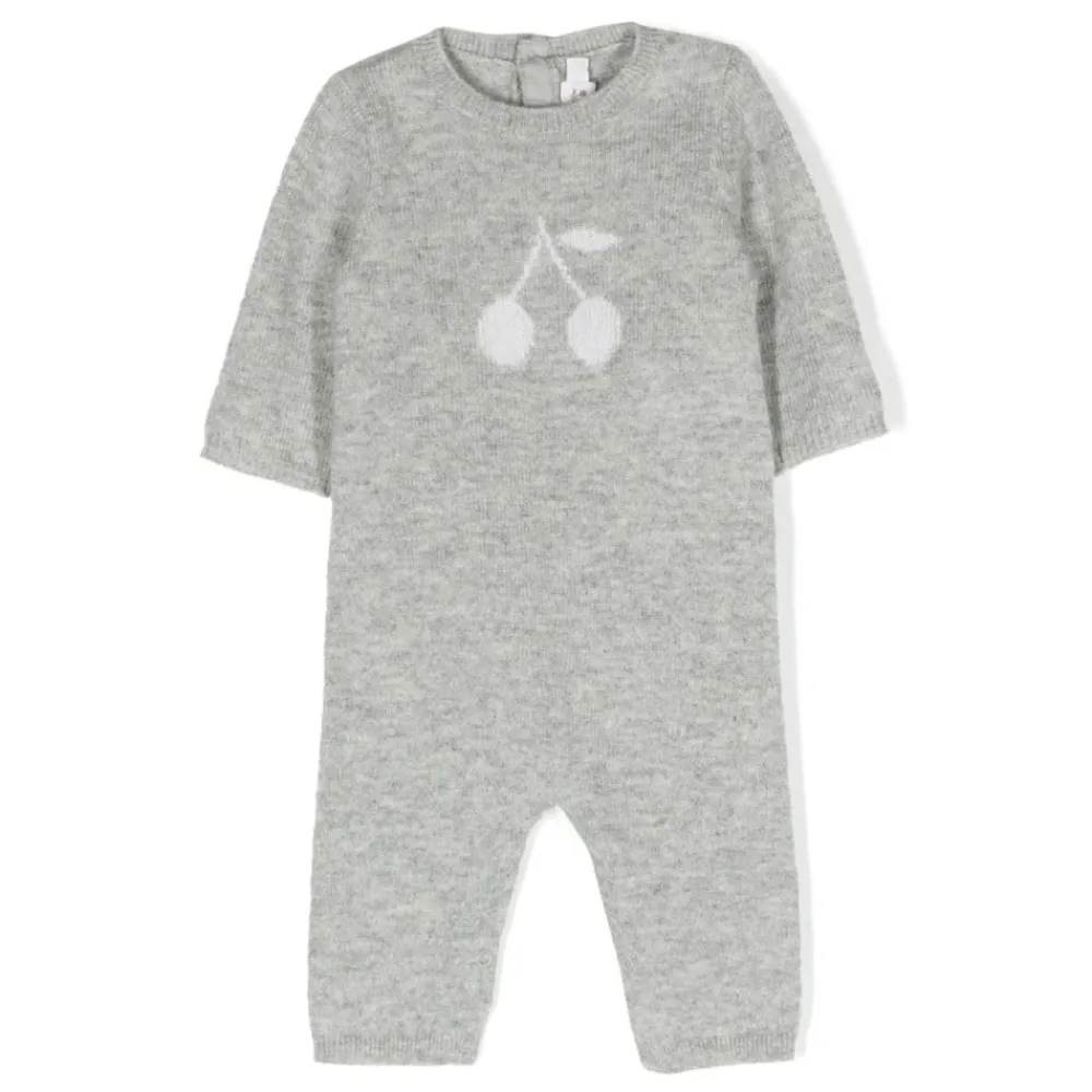 Kleiden Sie Ihre kleine Prinzessin mit Stil in diesem Tilouana Baby-Strampler von Bonpoint. Hergestellt aus ultraweichem grauem Melange-Kaschmir, verfügt er über das ikonische Bonpoint-Logo in Kirschfarbe auf der Vorderseite. Dieses zeitlose Kleidungsstück hat einen Rundhalsausschnitt, lange Ärmel, gerippte Borte und Knopfverschluss auf der Rückseite. Gerader Schnitt.