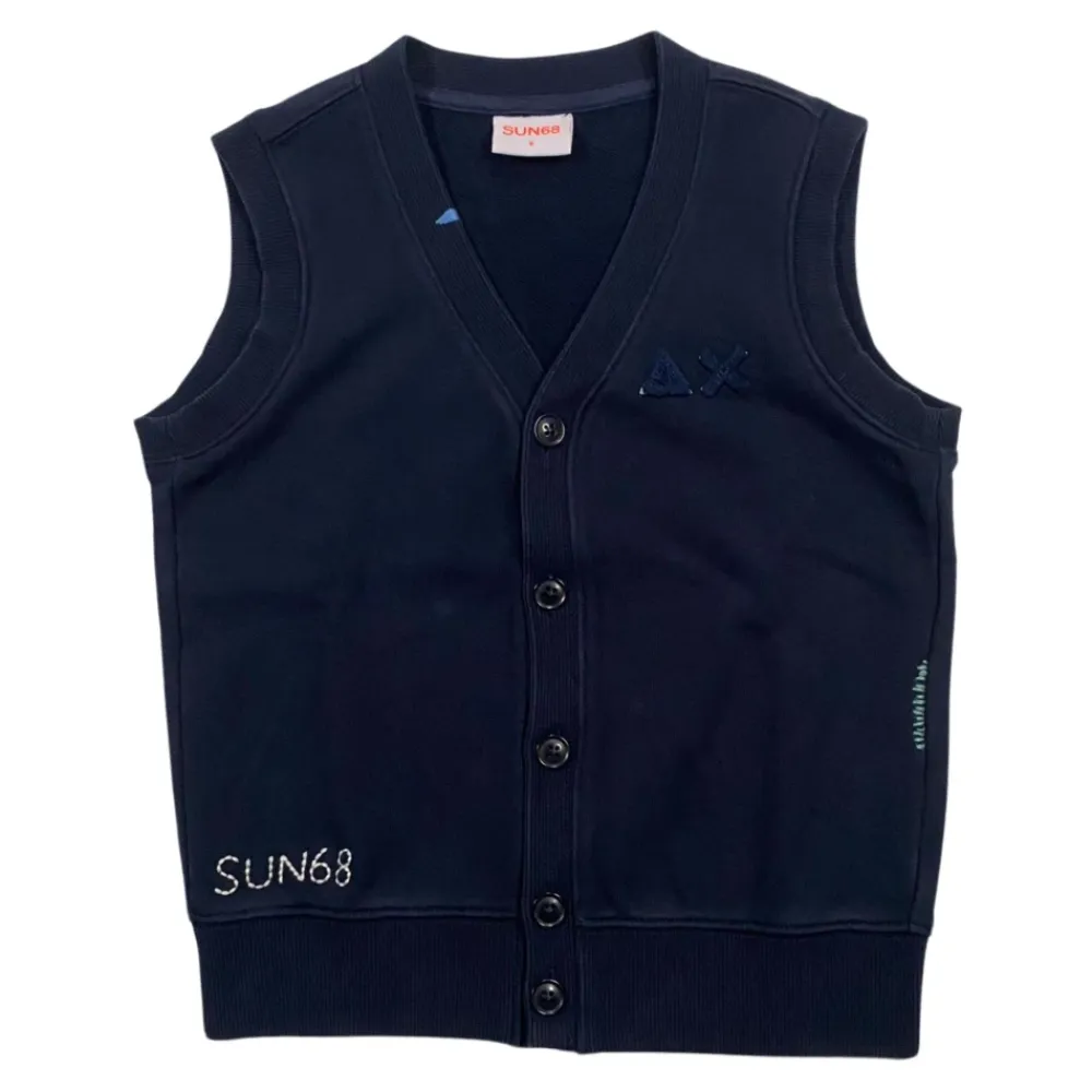 Sun68 Kids blaue Strickjacke mit V-Ausschnitt, ärmellos, mit kontrastierender Logo-Stickerei, gerippte Säume, reguläre Passform. Zusammensetzung: 100% Baumwolle.