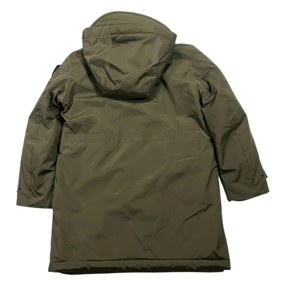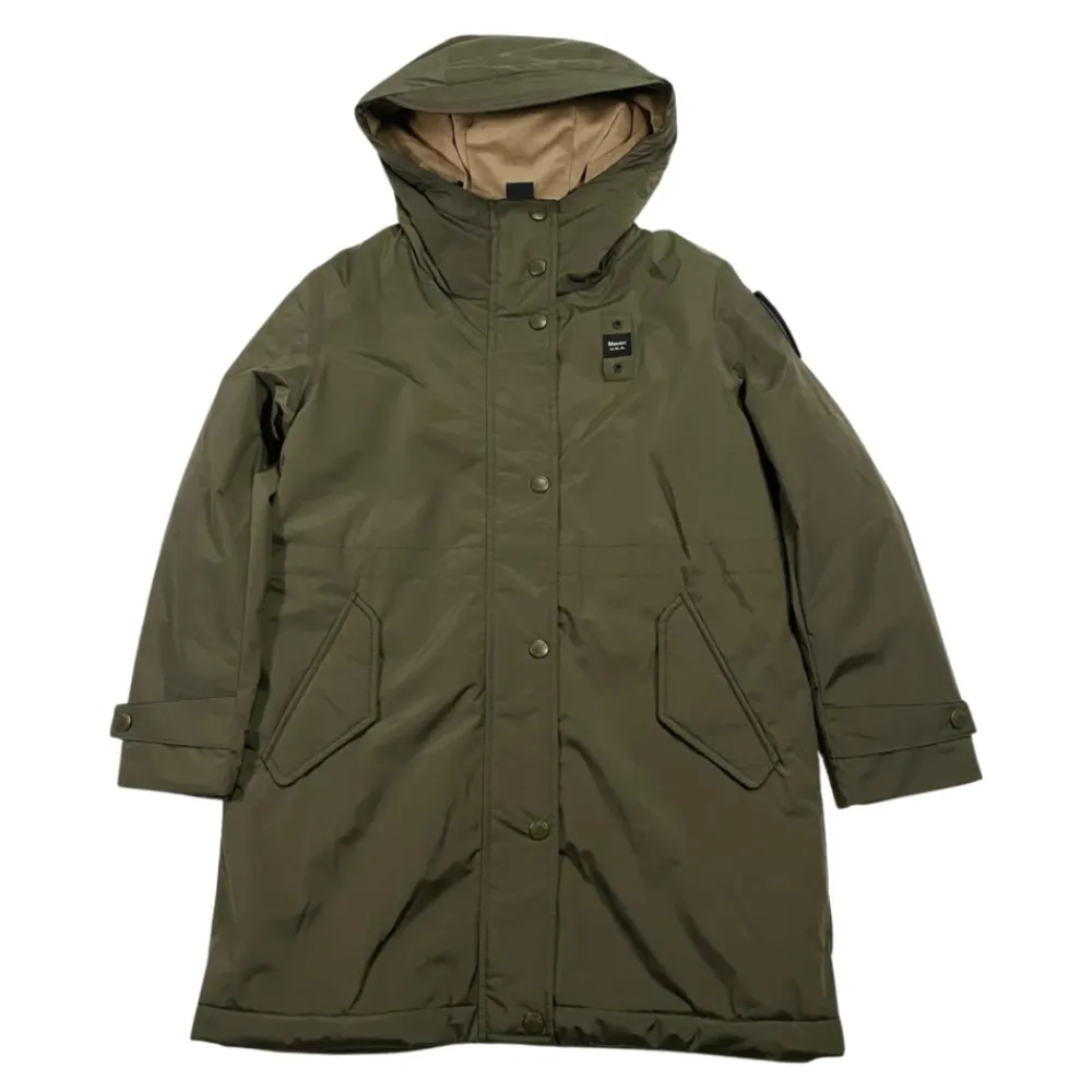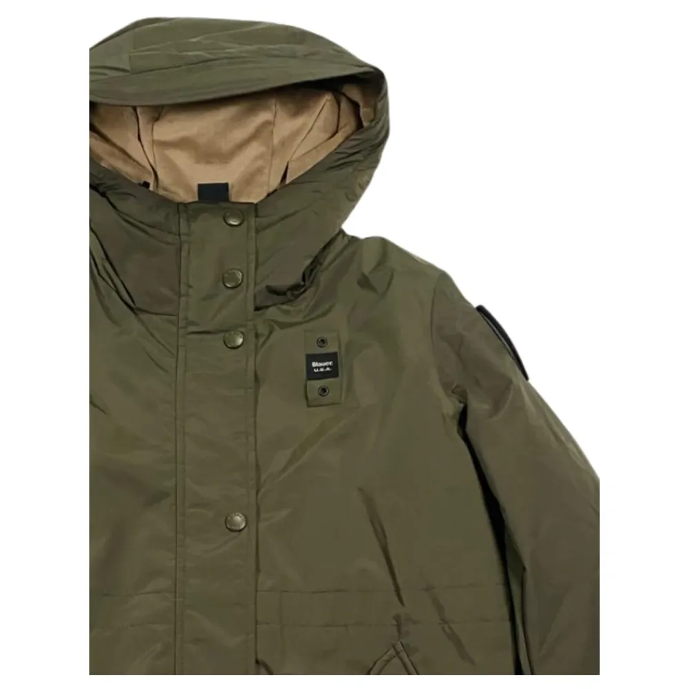 Blauer Kids grüne Jacke mit langem Design, weiches Kunstfell-Kontrastfutter, feste Kapuze, zwei Seitentaschen, Logo-Patch auf der Brust, Glitzerlogo am Arm, reguläre Passform. Zusammensetzung: 95% Polyamid, 5% Elastan. Füllung: 100% Polyester.