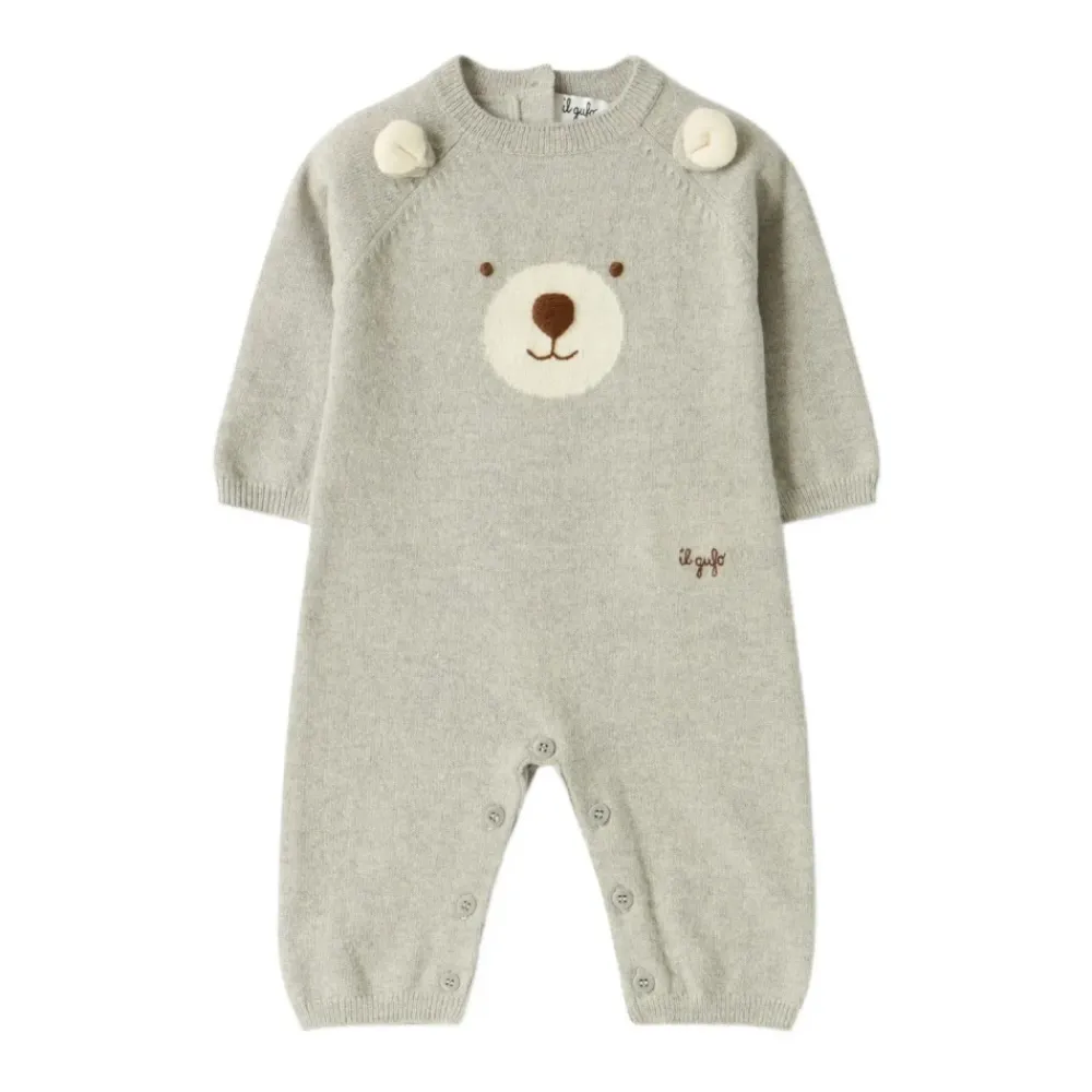Bleiben Sie gemütlich und stilvoll mit diesem entzückenden Il Gufo Grey Merino Wool Teddy Bear Strampler für Babys. Perfekt, um Ihr Kleines warm und stilvoll zu halten.