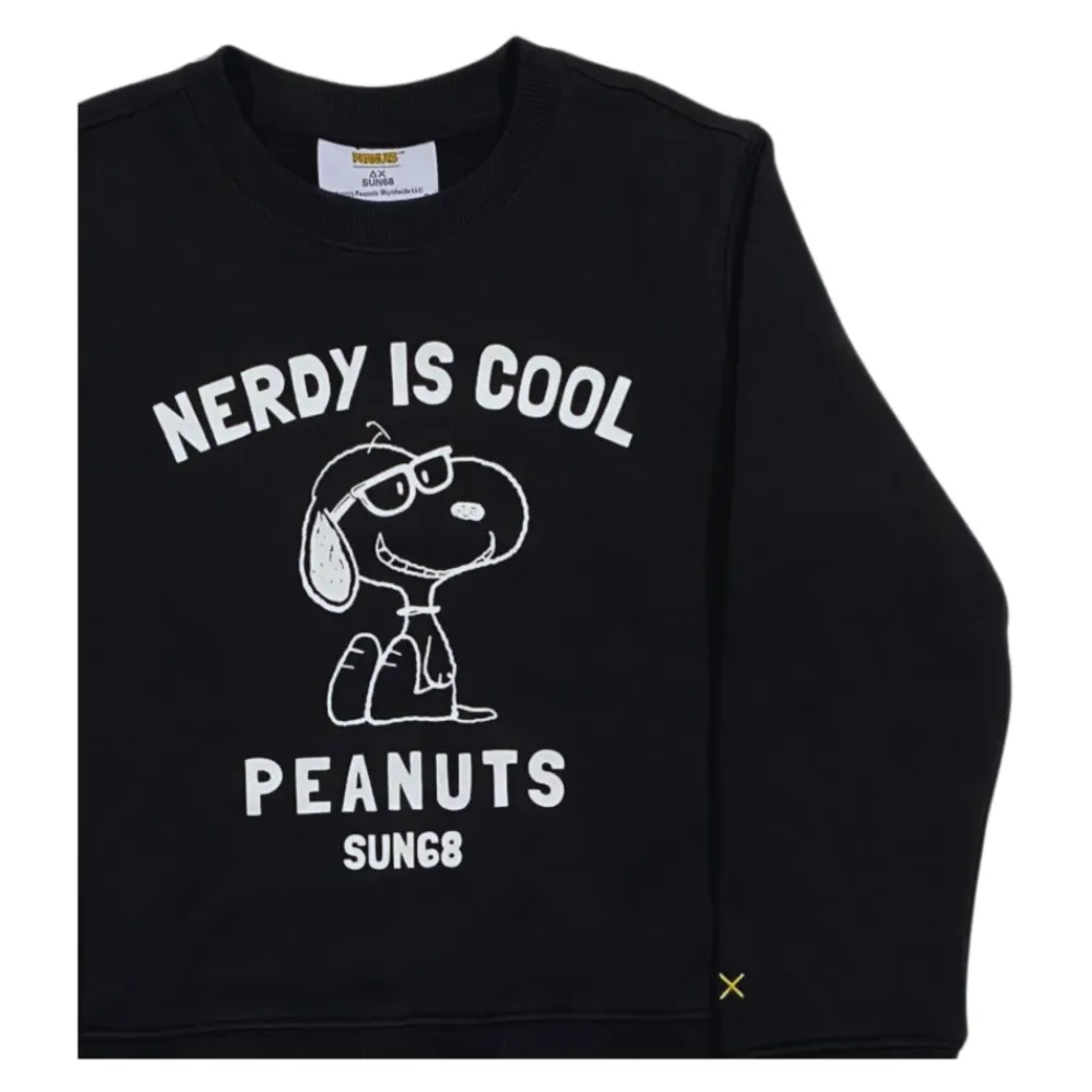 Sun68 Kids schwarzer Sweatshirt, Rundhalsausschnitt, langärmlig, mit kontrastierendem zentralem Snoopy-Druck, gerippte Kanten, reguläre Passform. Hergestellt aus 84% warmer Baumwolle und 16% Polyester.