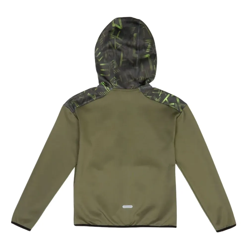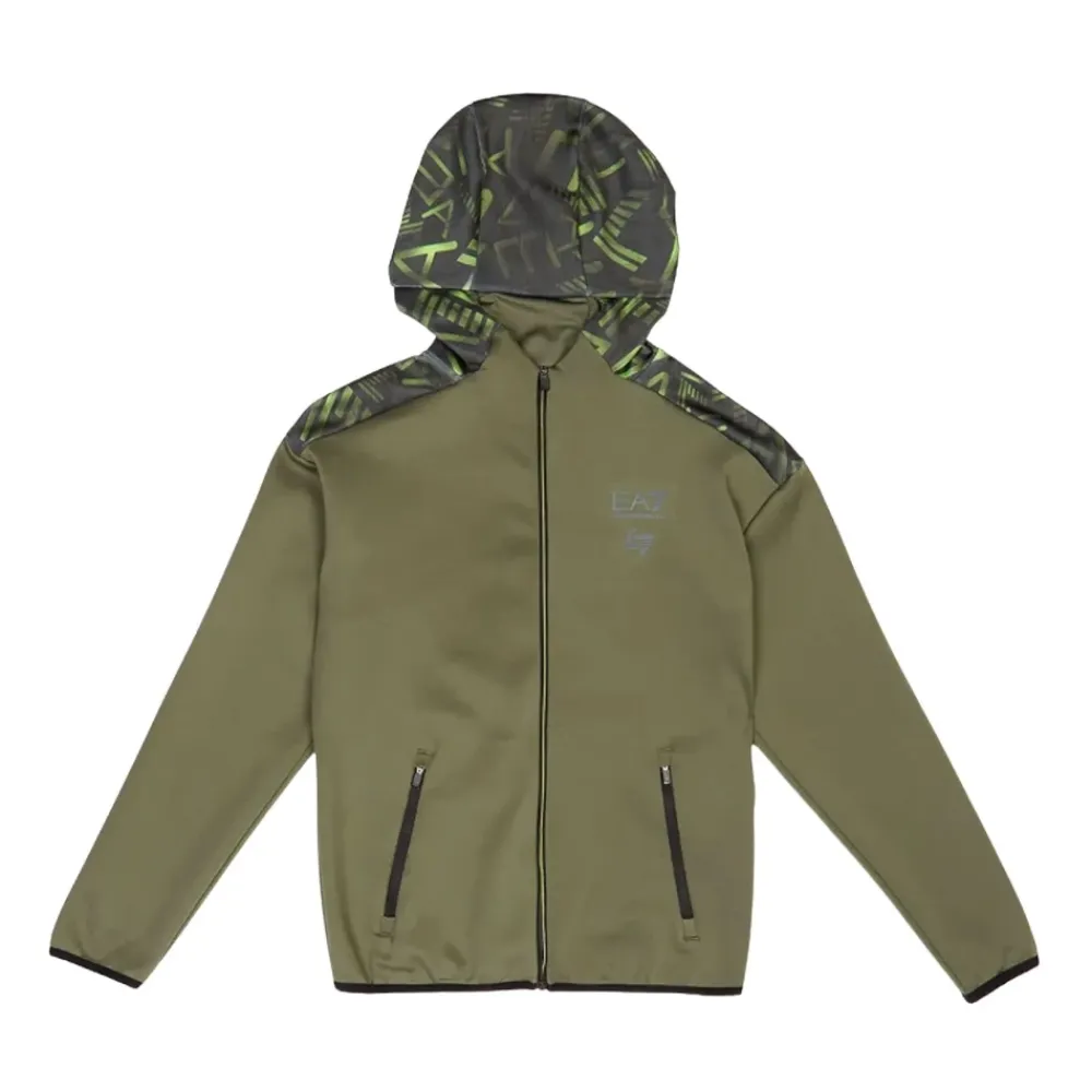 Emporio Armani EA7 Kinder Olivgrüne Reißverschlussjacke, perfekt für diejenigen, die einen legeren, aber dennoch raffinierten Look lieben. Hergestellt aus weichem und bequemem technischem Stoff, verfügt sie über abstrakte grafische Details in leuchtendem Grün und Schwarz an der Kapuze und den Schultern, die einen dynamischen und modernen Touch verleihen. Der durchgehende Reißverschluss und die zwei praktischen seitlichen Reißverschlusstaschen machen sie funktional und vielseitig, ideal für Trainingstage oder Freizeit. Das EA7-Logo auf der Brust in Grau-Blau-Tönen verleiht einen markanten und raffinierten Touch und macht diese Jacke zu einem Must-have für alle, die Komfort und Stil bei jeder Gelegenheit verbinden möchten. Empfohlenes Waschen und Bügeln bei mittlerer Temperatur. Herbst-Winter-Saison. Olivgrüne Reißverschlussjacke für Kinder, Regular Fit, Herbst-Winter 7B000146AF17999U8100. Materialdetails: 95% Polyester 5% Elastan.