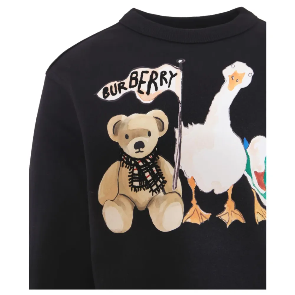 Kleide dein Kleines stilvoll mit diesem schwarzen Sweatshirt von Burberry Kids. Hergestellt aus weicher gebürsteter Baumwolle, verfügt es über lange Ärmel, gerippten Rundhalsausschnitt, Bündchen und Saum. Der Sweatshirt ist verziert mit einem Frontlogo, Bären- und Tierfreunde-Druck auf Vorder- und Rückseite. Hergestellt aus 70% Baumwolle, 30% Polyester. Maschinenwäsche bei 30°C.