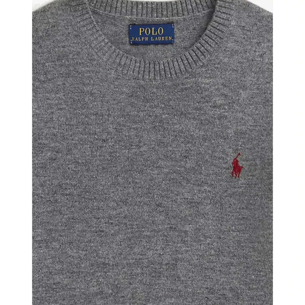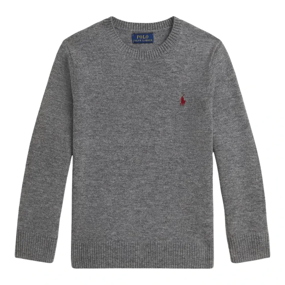 Werten Sie die Garderobe Ihres kleinen Jungen mit diesem Polo Ralph Lauren Wollpullover auf. Mit Rundhalsausschnitt, langen Ärmeln und einem kontrastierenden bestickten Logo auf der Vorderseite ist dieser graue Strick sowohl stilvoll als auch bequem. Hergestellt in Vietnam aus 100% Wolle, verfügt er über gerippte Kanten und einen geraden Saum. Erhältlich in den Größen S (7 Jahre), M (8/9 Jahre) und L (10/11 Jahre).