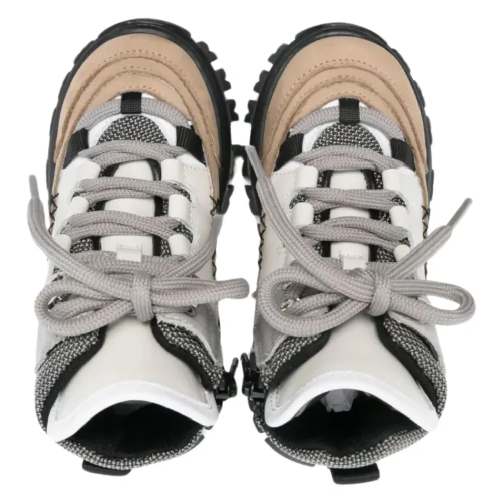Dsquared2 Kids beige/grau Lederstiefeletten mit Color-Block-Design, Schnürung vorne, seitlicher Reißverschluss, Fersenschlaufe, Ahornblattdetail, seitlicher Logodruck, dekorative Nähte, runde Zehenkappe, Logo-Print-Innensohle, Gummiprofilsohle, Knöchellänge. Außenmaterial: 100% Leder, 100% Kalbsleder Futter: 100% Stoff, 100% Kalbsleder. Hergestellt in Italien Sohle: 100% Gummi.