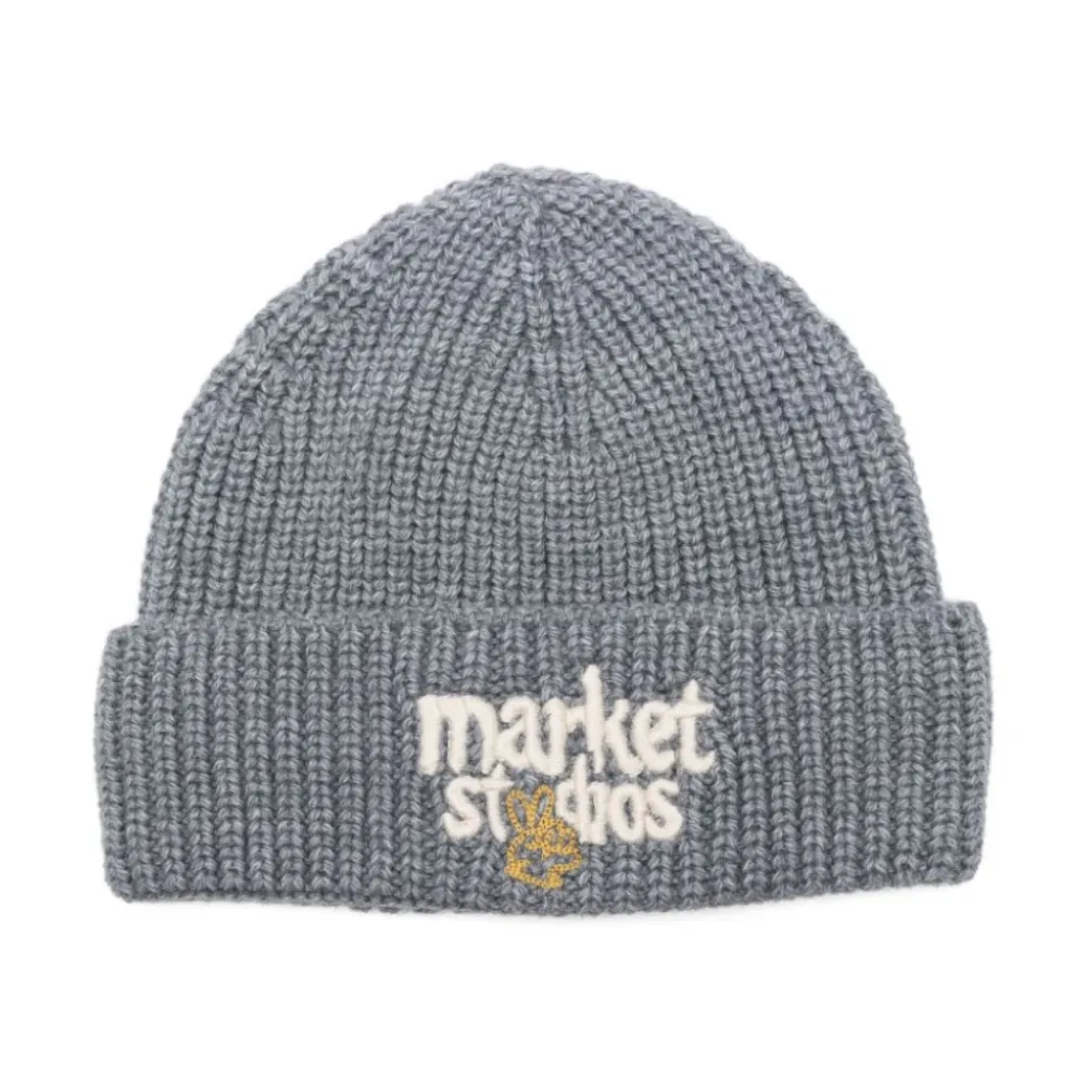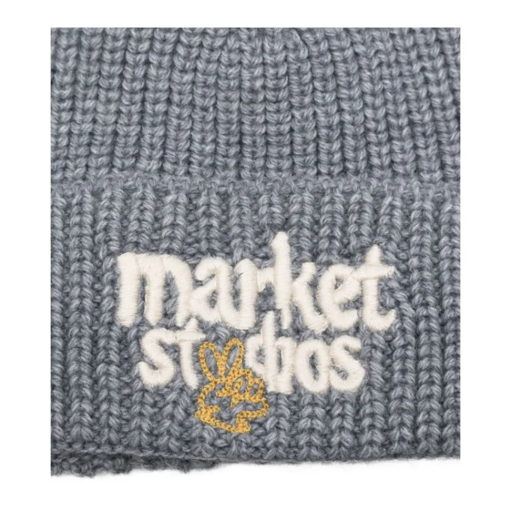 MARKET graue gerippte Strickmütze mit gesticktem Logo und umgeschlagenem Rand für Jungen.