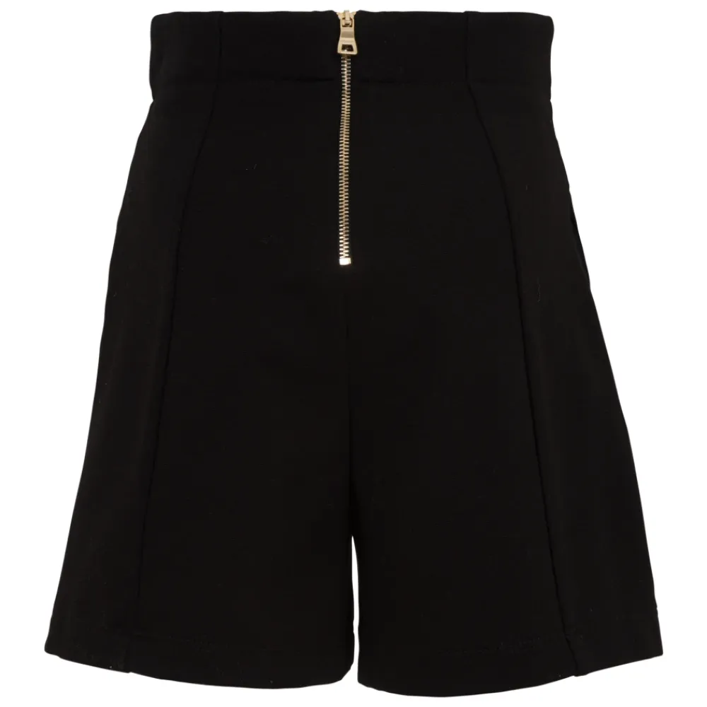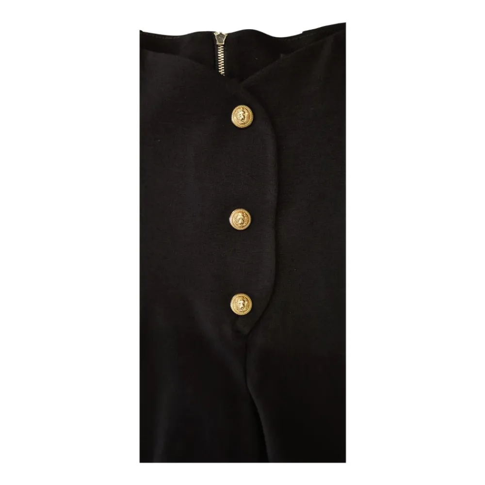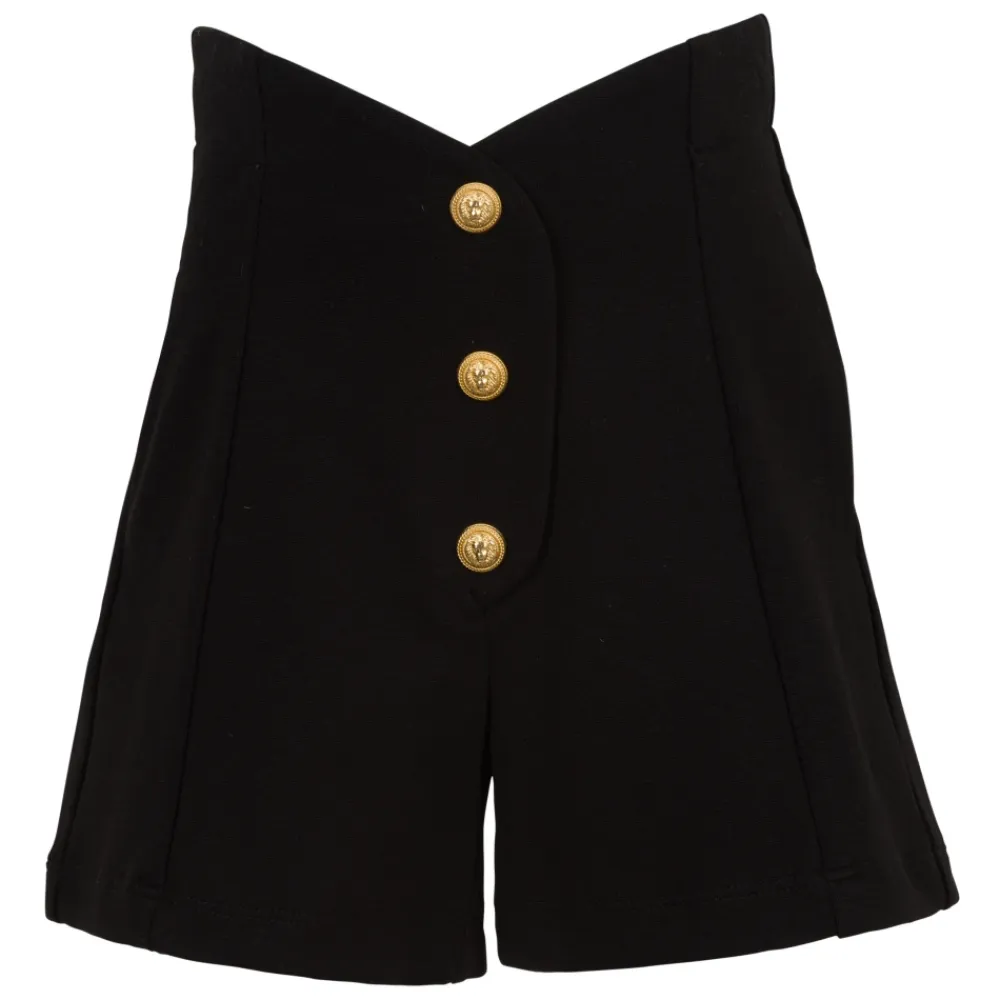 Balmain High-waist Button-detail Shorts mit ikonischen Knöpfen vorne, seitlichen Paspeltaschen und einem Reißverschluss hinten für einen maßgeschneiderten, aussagekräftigen Look. Hauptmerkmale: Schwarz | Nero | Oro | Reißverschluss hinten | Seitliche Paspeltaschen | Hohe Taille | Ikonisches Knopfdetail vorne | Maße und Passform: High-Waist-Passform
