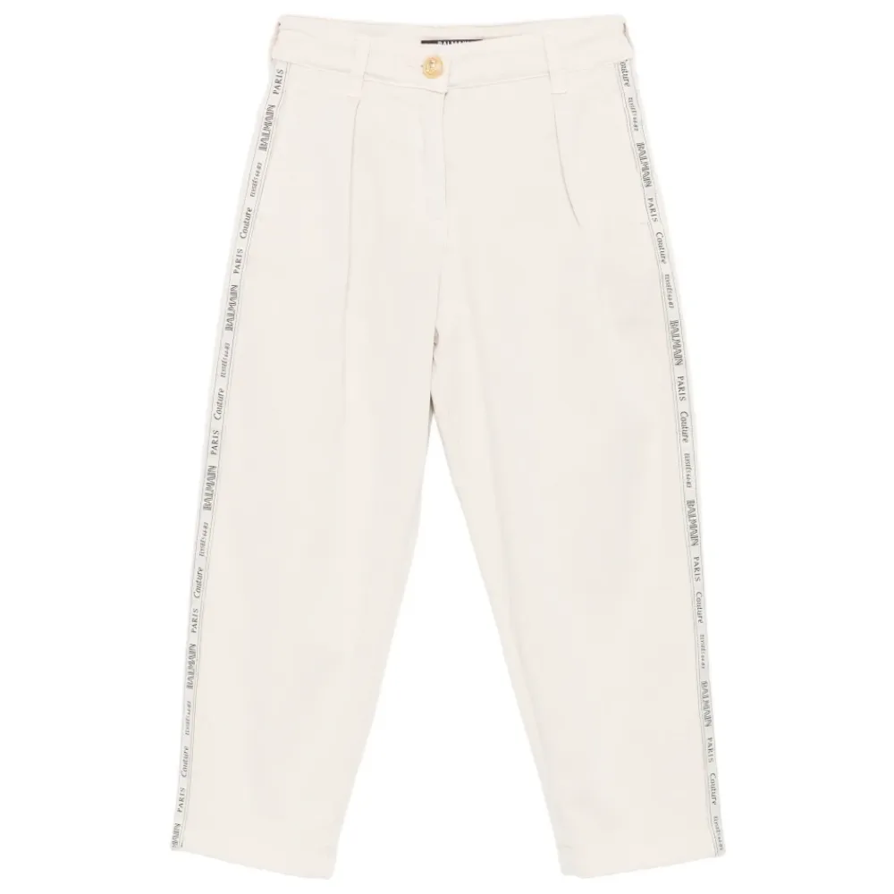 Balmain Hosen mit Falten-Details, Seitenstreifen und goldfarbenen Knopfdetails für einen edlen Alltagslook. Hauptmerkmale: Beige | Baumwolle | Goldfarbene Knöpfe | Falten vorne | Seitenstreifen | Logo-Motiv | Zusammensetzung und Pflege: 100 % Baumwolle