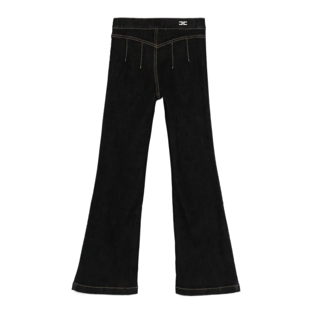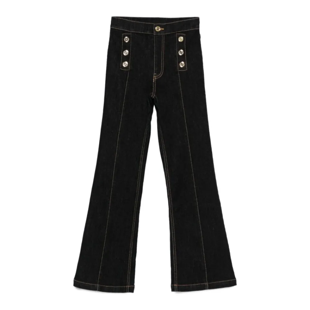 Elisabetta Franchi Jeans mit markanten goldfarbenen Knöpfen und Kontrastnähten, gefertigt für einen eleganten Alltags-Denim-Look. Hauptmerkmale: Blau | Goldfarbene Knopfverzierungen | Kontrastnähte | Dunkelblaue Waschung