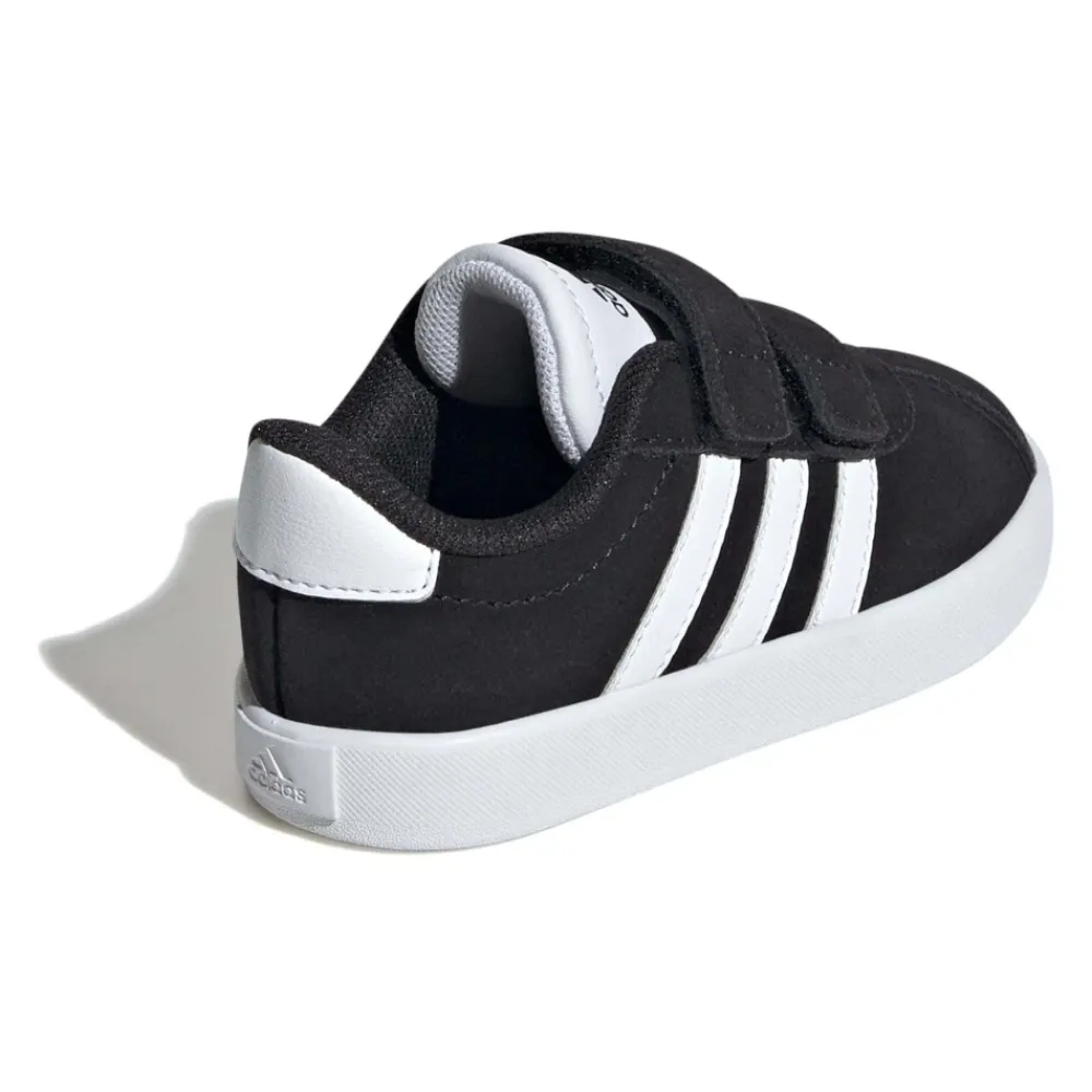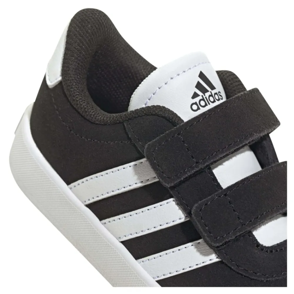 Adidas Kinder Sneakers in Cblack/Ftwwht/Cblack Farbgebung. Hergestellt aus synthetischem Leder-Obermaterial, Stofffutter und synthetischer Sohle. Mit Klettverschluss, ikonischen drei Seitenstreifen, kontrastierender Zunge und Ferse. Reguläre Passform. Material: 70% Synthetik, 30% Stoff.