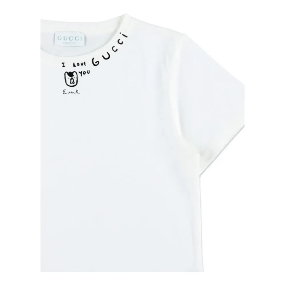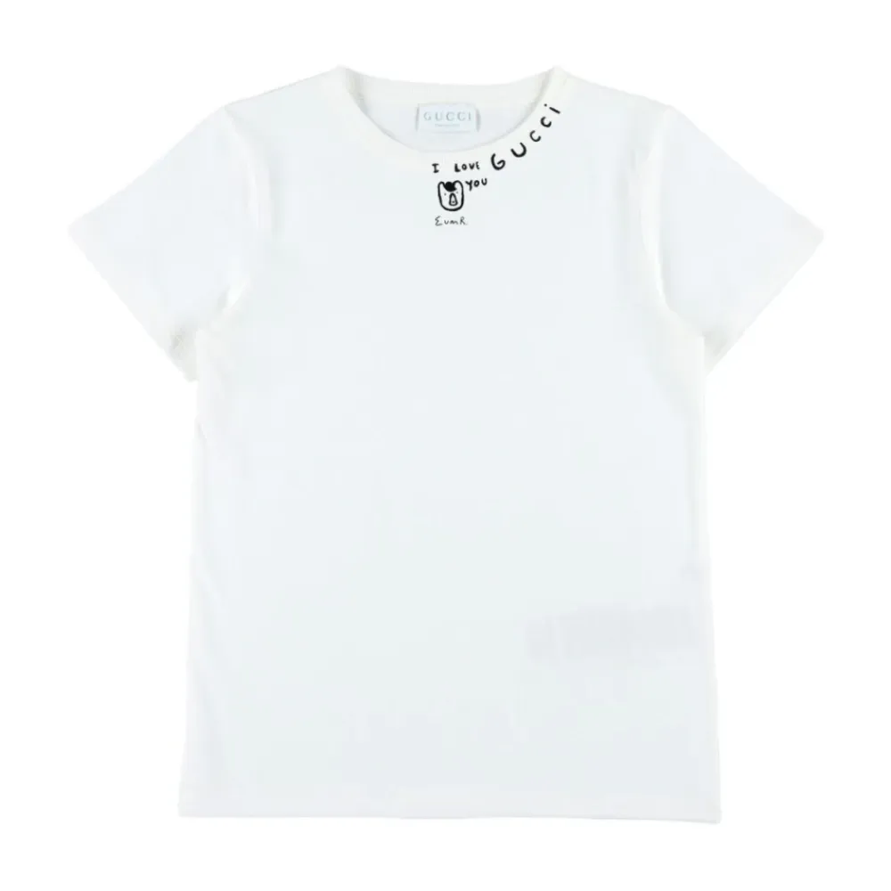 Gucci Kurzärmeliges T-Shirt mit auffälligem Logo-Schriftzug auf der Brust für eine einfache, gebrandete Alltagsschicht. Hauptmerkmale: Weiß | Neu Weiß | Baumwolle | Rundhalsausschnitt | Kurze Ärmel | Logo-Schriftzug auf der Brust