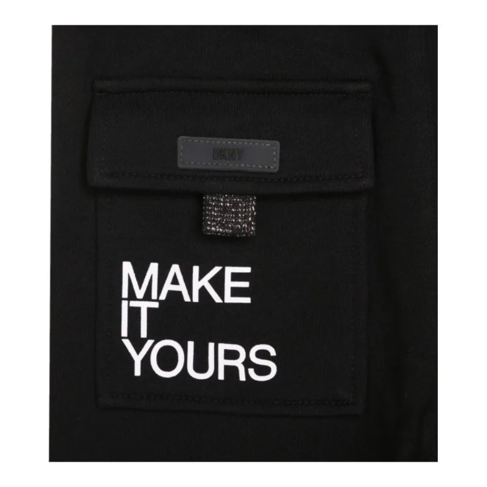 Diese DKNY-Hose besteht aus weichem 100% Baumwollstoff. Sie zeigt die perfekte Fusion von urbaner Mode und entspannter Funktionalität, die entwickelt wurde, um junge Abenteurer auf jedem Schritt des Weges zu begleiten. Das Jogging-Design hat eine lockere Silhouette, die Bewegungsfreiheit ermöglicht und ideal für aktives Spielen und urbane Abenteuer ist. Das ikonische DKNY-Logo sticht im Design hervor und verleiht einen Hauch von Authentizität und erkennbarem Stil. Der verstellbare elastische Bund sorgt für eine perfekte und bequeme Passform, während die praktischen Taschen Platz für kleine Essentials bieten oder einfach nur zum Warmhalten der Hände dienen. Egal, ob für einen Tag in der Schule, sportliche Aktivitäten oder einfach nur zum Entspannen zu Hause, diese Hose bietet die perfekte Balance zwischen Stil und Komfort. Kombinieren Sie sie mit T-Shirts, Sweatshirts oder anderen Kleidungsstücken, um lässige und moderne Looks zu kreieren.