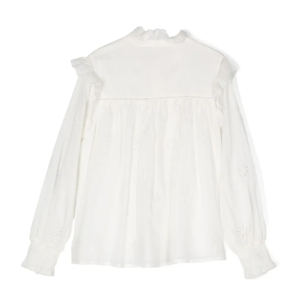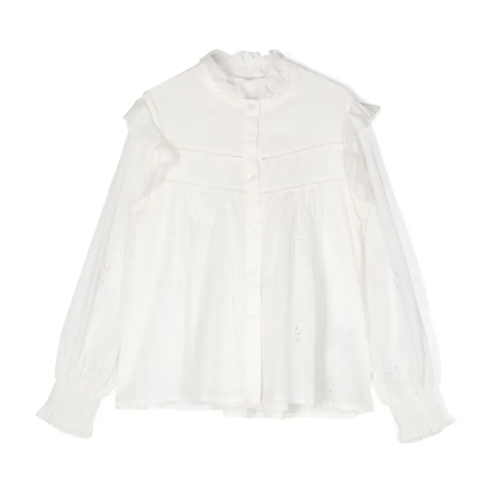 Werten Sie jede Garderobe mit diesem stilvollen Langarmshirt von Chloé auf, das elegante Voile-Ärmel und filigrane Broderie-Anglaise-Sterne aufweist. Wichtige Merkmale: Bianco Sporco | Weiß | Baumwolle | Lange Voile-Ärmel | Broderie-Anglaise-Sterne | Knopfverschluss | Maße und Passform: Normale Passform | Zusammensetzung und Pflege: 100% Baumwolle | Maschinenwäsche kalt, bei niedriger Temperatur im Trockner trocknen