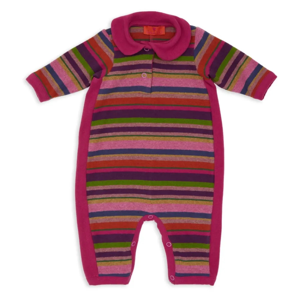 Langärmeliger, fußloser Strampler aus weichem Fleece mit rundem Kragen und Knopfverschluss. Mehrfarbiges Streifenmuster, lila Schattierungen und einfarbige Seitenbänder. Dank des Druckknopfverschlusses schnell und einfach anzuziehen. Ikonoischer, mehrfarbiger Druck mit zarten, zeitlosen Farben: eine perfekte Geschenkidee.