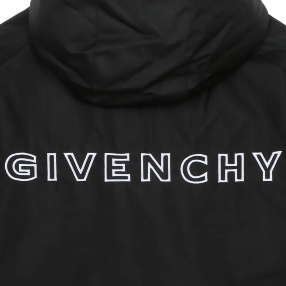 Verleihen Sie der Oberbekleidung Ihres Kindes einen Hauch von Luxus mit dem Givenchy Logo-bestickten Kapuzenmantel. Er zeichnet sich durch ein elegantes, schwarzes Design mit markanter Logo-Stickerei auf der Rückseite und der Brust aus. Dieser stilvolle Mantel ist perfekt, um jedem Alltagslook eine besondere Note zu verleihen. Wichtige Merkmale: Schwarz | Polyester | Frontreißverschluss | Zwei Seitentaschen | Kapuzendesign | Gestickte Logos | Ärmel mit anliegenden Bündchen | Gerader Saum | Maße und Passform: Normale Passform | Zusammensetzung und Pflege: 100% Polyester | Maschinenwäsche kalt, Trocknergeeignet bei niedriger Temperatur