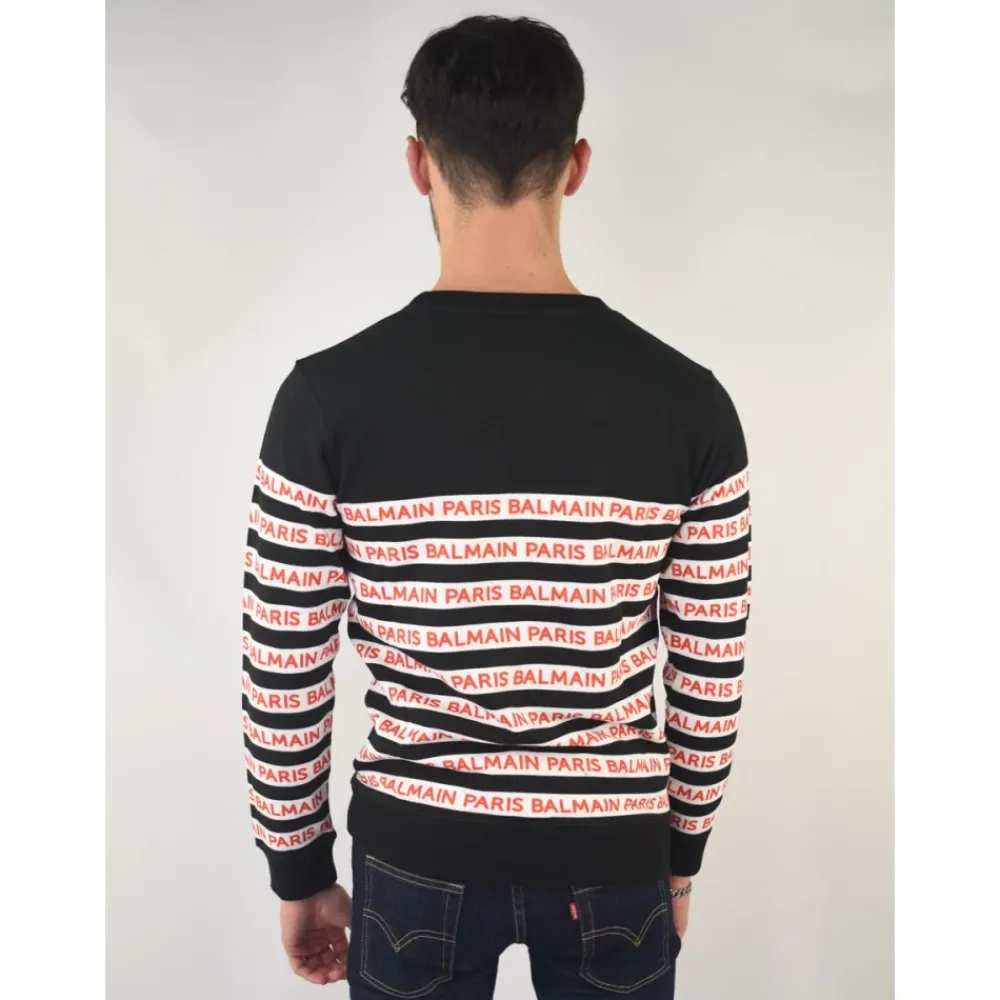 Balmain präsentiert das Logo Let Rundhals-Sweatshirt, ein stilvolles Kleidungsstück mit Allover-Logo-Schriftzug und kontrastierenden horizontalen Bändern. Perfekt für Frühling und Herbst, kombiniert dieses Sweatshirt Komfort und Mode mühelos. Wichtige Merkmale: Schwarz | 100% Baumwolle | Rundhalsausschnitt | Allover-Logo-Schriftzug | Kontrastierende horizontale Bänder | Maße und Passform: Normale Passform | Zusammensetzung und Pflege: 100% Baumwolle | Maschinenwäsche kalt, trocknergeeignet bei niedriger Temperatur.