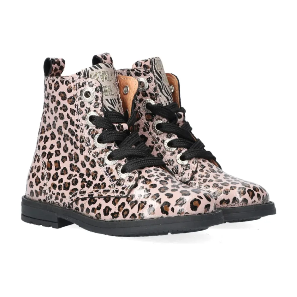 Lassen Sie Ihre kleine Tochter mit diesen fröhlichen Schnürstiefeln 42104 von DEVELAB stilvoll auftreten. Hergestellt aus rosa Leder mit grober Struktur, hohem Glanz und einem braunen Leopardenmuster, werden diese Stiefel sicherlich auffallen. Die Zunge ist mit einem Textil-Markenetikett mit Tierdruck und goldfarbenen Nähten verziert. Innen im Schuh befindet sich ein Reißverschluss mit Klettverschluss für einfaches An- und Ausziehen. Das komfortable Lederfutter und das herausnehmbare Fußbett sorgen für ganztägigen Komfort. Die Gummisohle hat ein robustes Aussehen und ein griffiges Rillenprofil für Laufen und Spielen.
