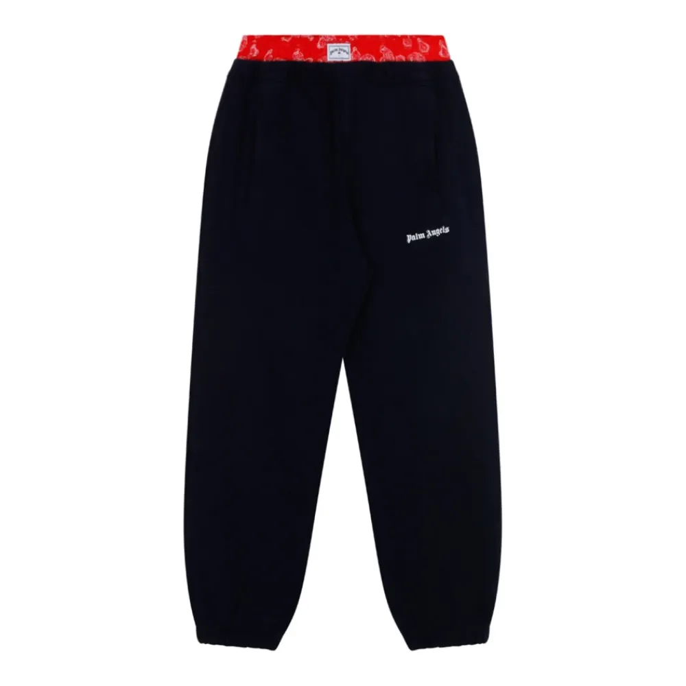 Entdecken Sie die marineblaue und rote Baumwoll-Trainingshose von Palm Angels mit einem verspielten Teddybär-Print und Logo-Detail, perfekt für lässige Ausflüge. Wichtige Merkmale: Marineblau | Rot | Baumwolle | Elastischer Bund | Zwei vordere Leistentaschen | Elastische Knöchel | Logo-Print auf der Vorderseite | Teddybär-Print | Maße und Passform: Normale Passform | Zusammensetzung und Pflege: Baumwolle