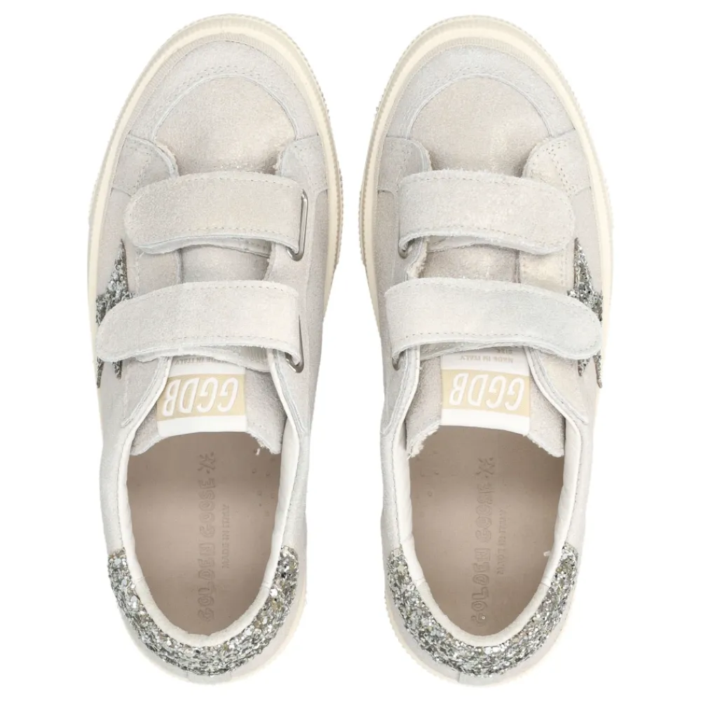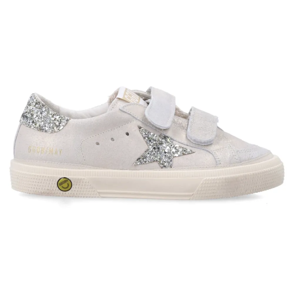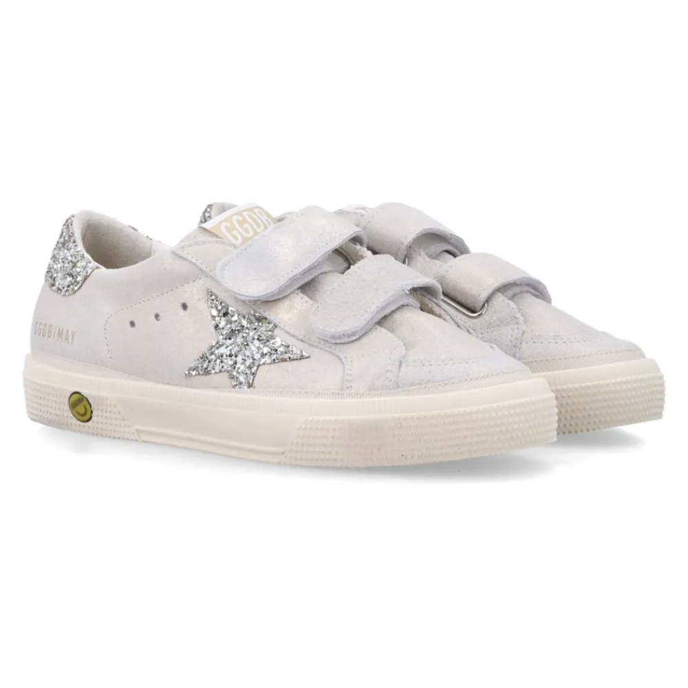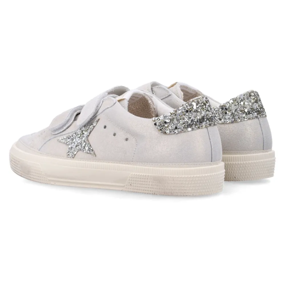Der Golden Goose May School Laminated Sneaker vereint die Vintage-inspirierte Ästhetik des Labels mit metallisiertem Wildleder und Glitzerakzenten für einen strahlenden Alltagslook. Hauptmerkmale: Weiß | Platin | Wildleder | Gummisohle | Bequem | Klettverschluss | Silber-Glitzer-Stern-Patch | Glitzer-Fersenlasche | Metallisiertes Finish