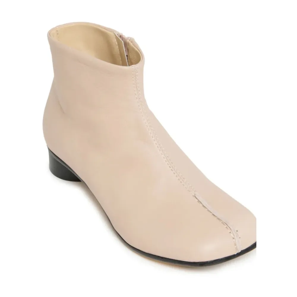 MM6 Maison Margiela niedrige Lederstiefel mit zylindrischem Absatz und erhabener Zehennaht, entworfen, um Sie vom Alltag zu formelleren Anlässen zu begleiten. Das Design unterstreicht die charakteristische Naht auf der Rückseite der Marke und einen internen Reißverschluss für einfaches Tragen. Hauptmerkmale: Beige | Kalbsleder | Interner Reißverschluss | Sohle aus Leder und Thermoplast | Erhabene Zehennaht | Signatur-Rückstich | Zylindrischer Absatz | Niedrige Knöchelsilhouette | Abmessungen & Passform: Absatzhöhe: 2 cm | fit_information | Zusammensetzung & Pflege: 100 % Kalbsleder (Obermaterial) | Ledersohle | Thermoplast | Hartfaserabsatz