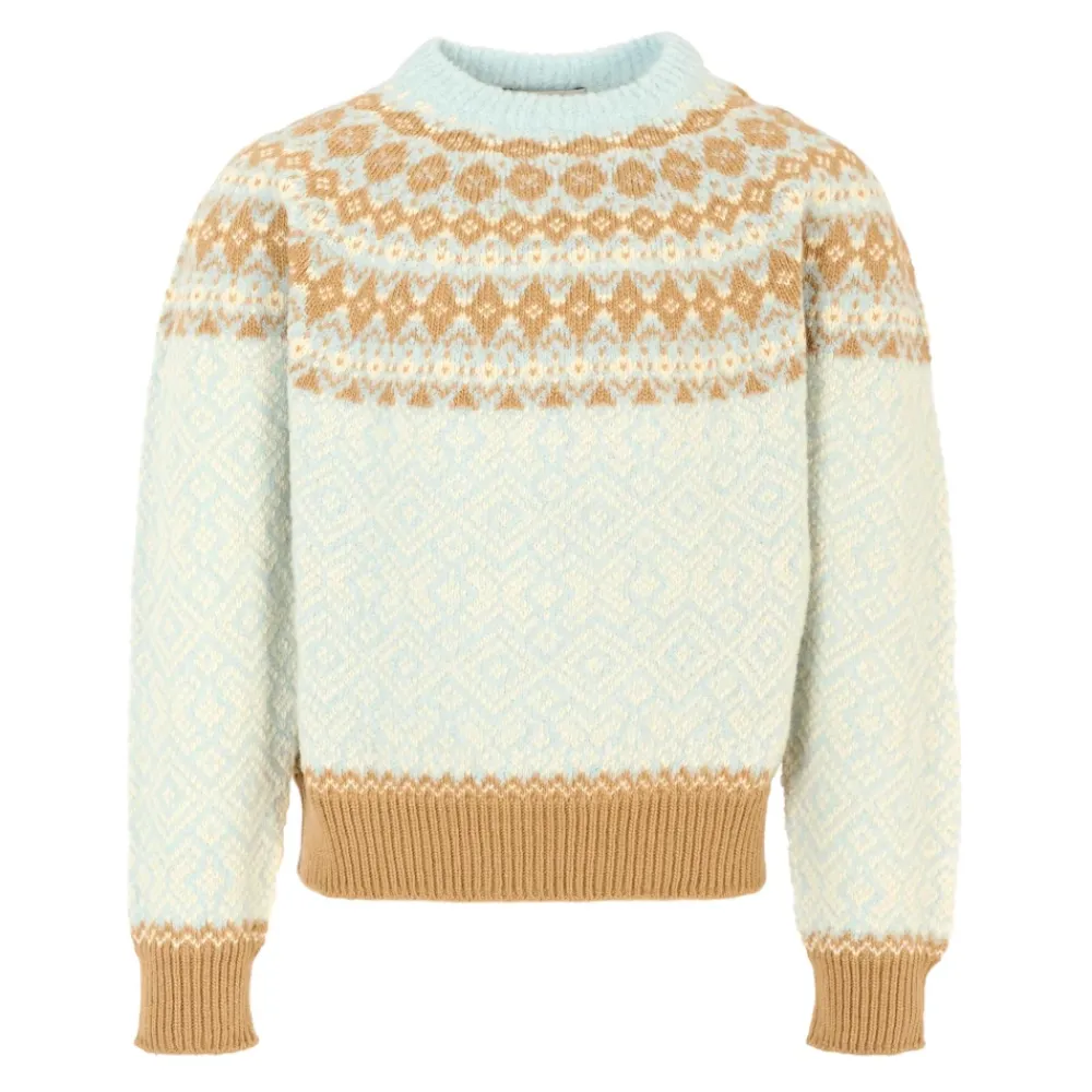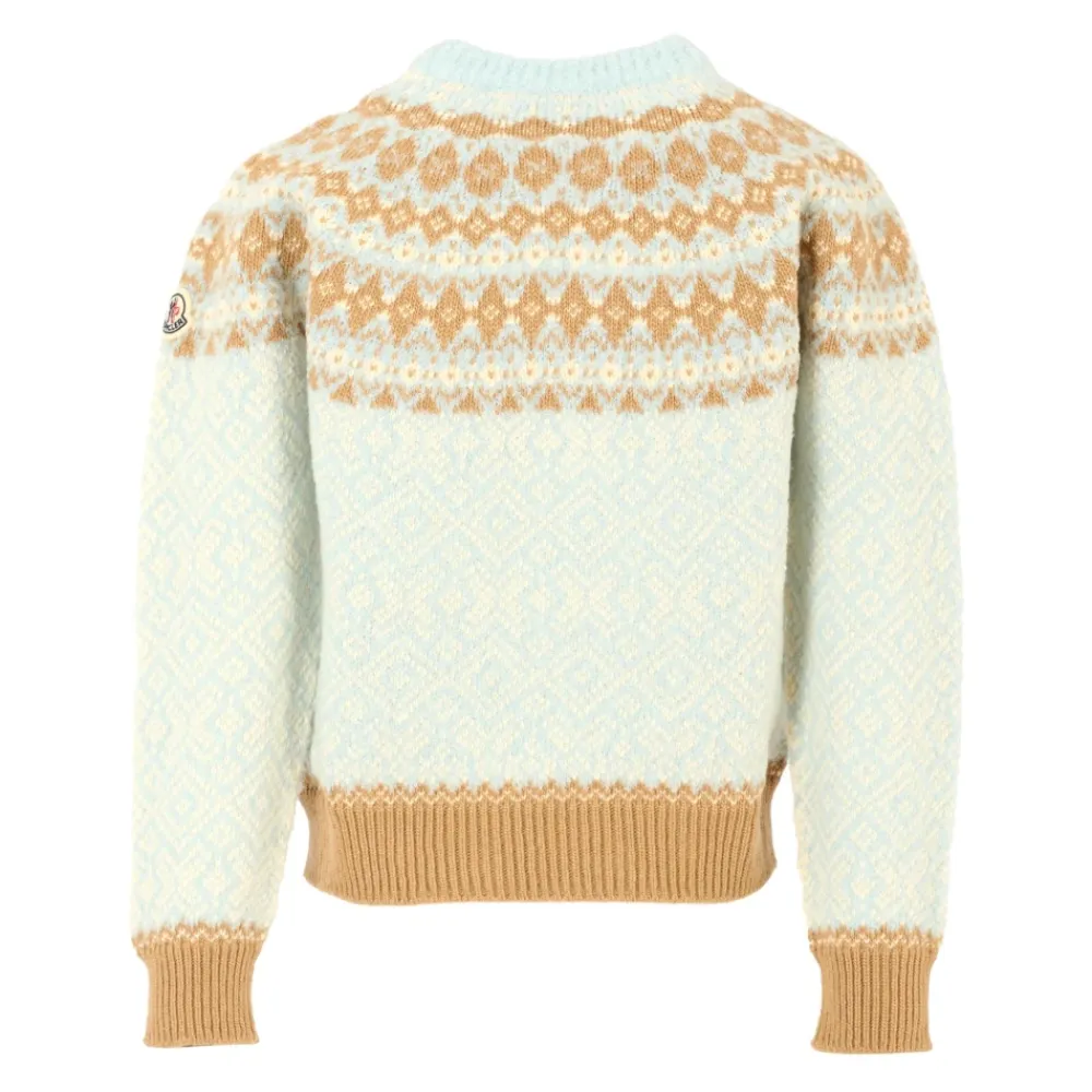 Kleiden Sie Ihr Kleines stilvoll in diesen Moncler hellblauen Wollpullover. Mit langen Ärmeln, einem Rundhalsausschnitt, gerippten Bündchen und Saum ist dieser Pullover mit einem nordischen Jacquardmotiv auf der Vorderseite und einem ikonischen Logopatch am Ärmel verziert. Hergestellt in Italien aus 90% Wolle und 10% Polyamid. Nur Handwäsche.