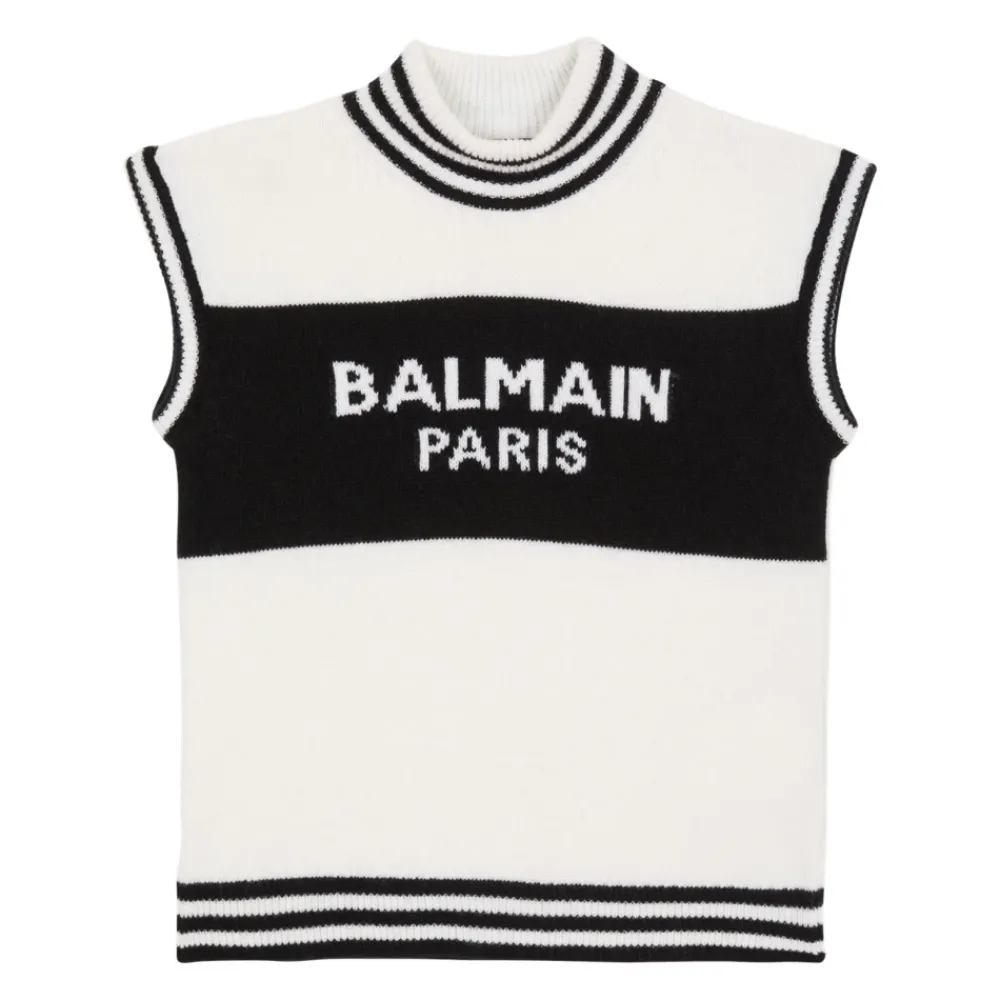Balmain Paris Strickpullunder Gerader Schnitt Stehkragen Balmain Paris-Logo auf kontrastierendem Hintergrund Abschlüsse mit gestreiften Rippenbündchen Hauptmaterial: 70 % Wolle, 30 % Kaschmir Hergestellt in Portugal Artikel: BV9A51Z2361