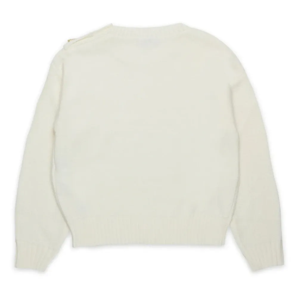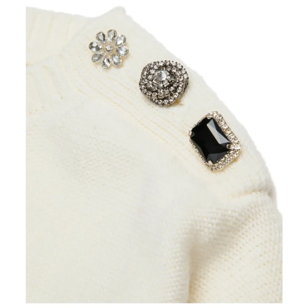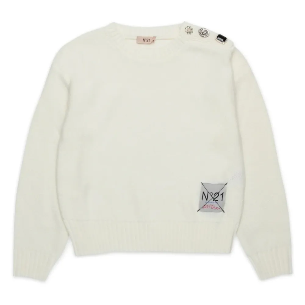 N21 Pullover aus gerippter Strickwollmischung, der Komfort und Stil vereint. Die drei Schmuckknöpfe auf der Schulter, jeweils unterschiedlich voneinander, verleihen dem Kleidungsstück eine Note von Eleganz und Originalität, was es einzigartig und anspruchsvoll macht. Rundhalsausschnitt, lange Ärmel, Verschluss mit Schmuckknöpfen auf der Schulter. N°21-Label am unteren Saum. Gerippte Strickwollmischung. Gerippter Kragen, Bündchen und Saum. Hergestellt aus 50% Wolle 50% Acryl.