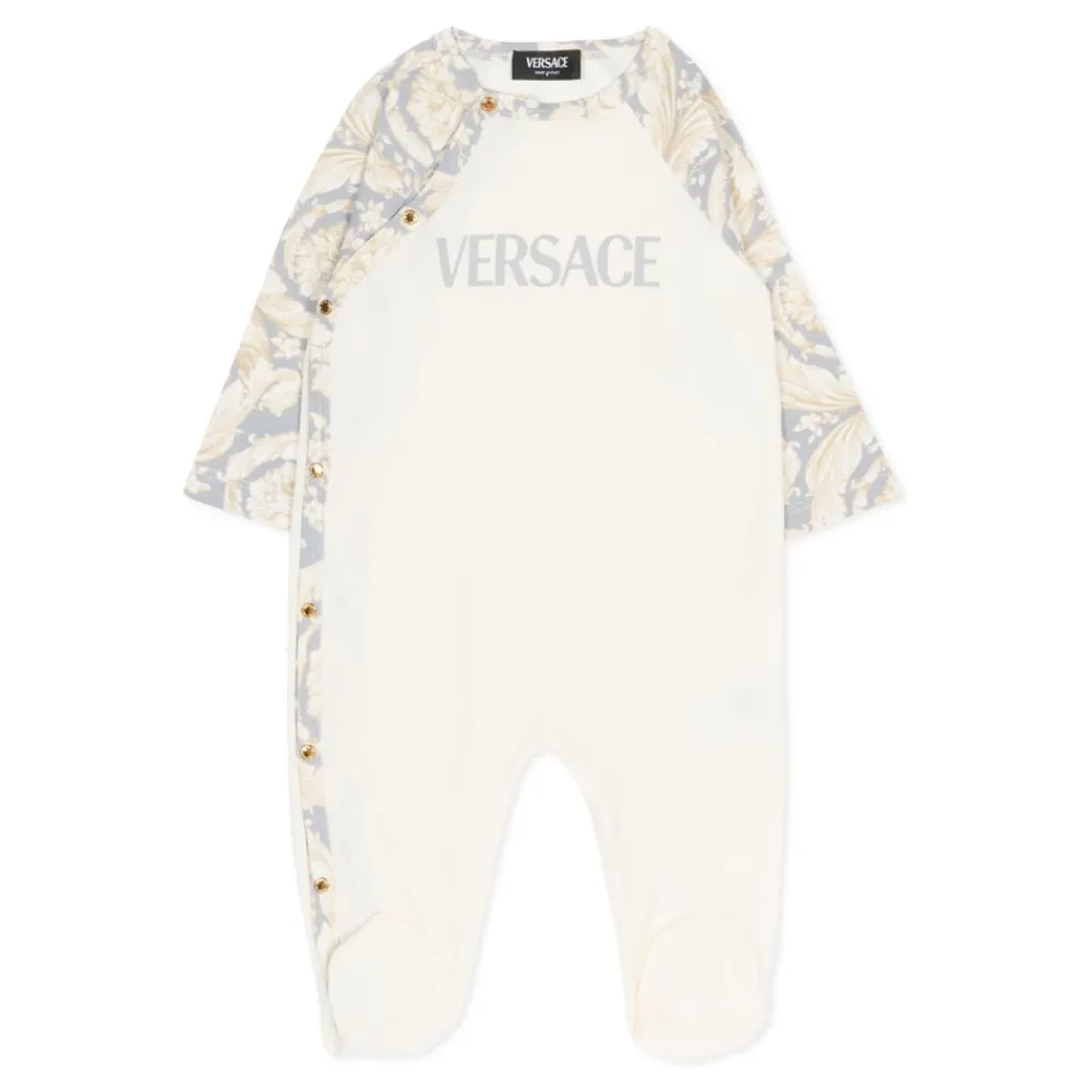 Versace Romper aus einem Stretch-Baumwollmischgewebe, veredelt mit barocken Ärmeldetails und einem grauen Logo für einen edlen Look. Mit Rundhalsausschnitt, vorderem Druckknopfverschluss und integrierten Füßen für einfaches Anziehen. Wichtige Merkmale: Weiß | Baumwollmischung | Vorderer Druckknopfverschluss | Integrierte Füße | Rundhalsausschnitt | Lange Ärmel | Barock-Motiv auf den Ärmeln | Graues Versace-Logo auf der Vorderseite | Zusammensetzung & Pflege: 91% Baumwolle | 9% Elastan | Maschinenwäsche bei 30°C.