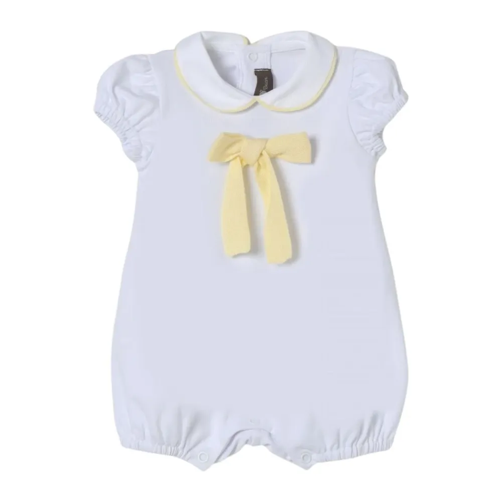 Kleiden Sie Ihr Kleines stilvoll mit diesem bezaubernden Strampler von Little Bear. Mit Rüschenärmeln und einem niedlichen Schleifenakzent verleiht dieser Baumwollstrampler der Garderobe Ihres Babys eine süße Note.