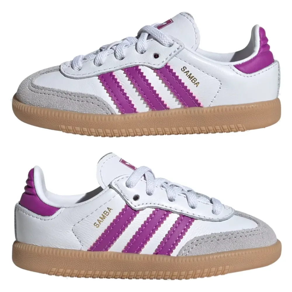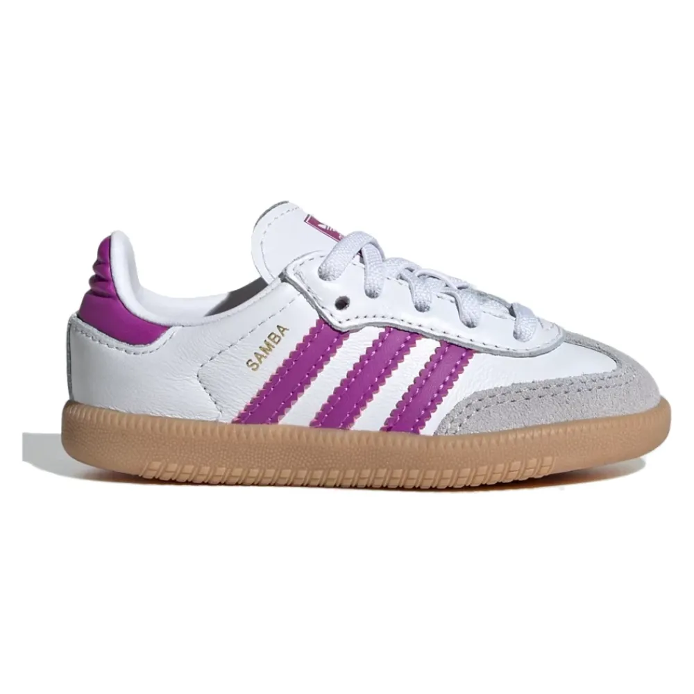 Mit den ikonischen Samba OG Junior Sneakern betrittst du die Straßen – eine Hommage an den klassischen Stil, der in den 60er Jahren von Fußballlegenden getragen wurde und jetzt für alltäglichen Komfort gefertigt ist. Wichtige Merkmale: Cloud White | Purple Burst | Gum | Leder | Elastische Schnürsenkel | Iconische 3 Streifen | Caramel Gummisohle | Maße und Passform: Klassische Passform | Zusammensetzung und Pflege: Obermaterial aus Leder | Mit einem feuchten Tuch abwischen