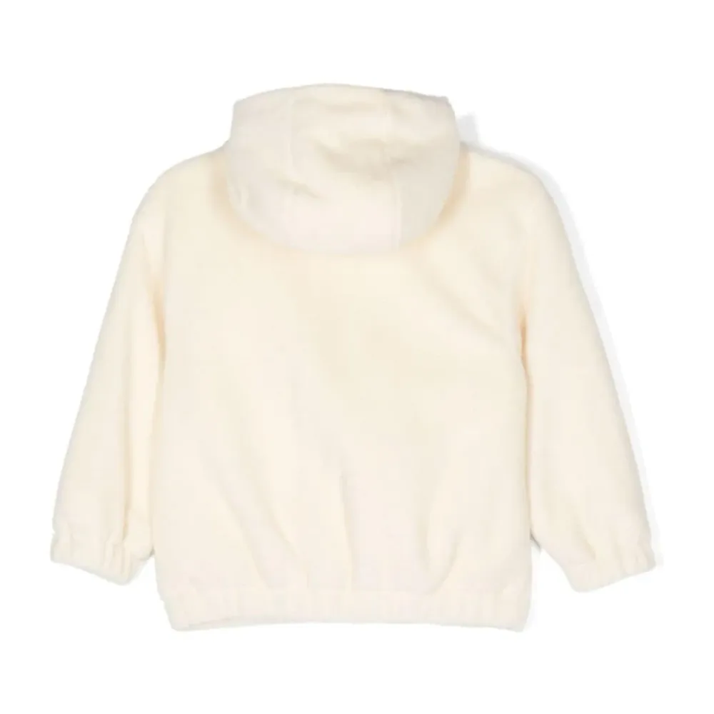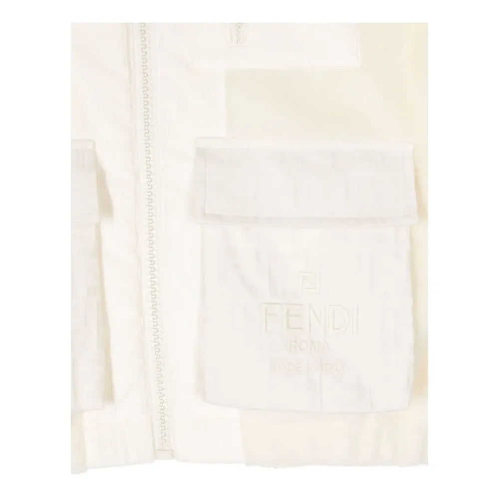 Bleiben Sie warm und stilvoll mit dieser cremeweißen Faux-Shearling Winterjacke von Fendi. Mit Cord-Einsätzen und einer klassischen Kapuze ist diese Jacke perfekt für kaltes Wetter. Wichtige Merkmale: Weiß | Beige | Faux-Shearling | Brusttasche mit Reißverschluss | Zwei vordere Pattentaschen mit FF-Motiv | Elastischer Saum | Cord-Einsätze | Klassische Kapuze | Überschnittene Schulter | Lange Ärmel mit elastischen Bündchen | Gesticktes Logo auf der Vorderseite | Vollständig gefüttert | Frontreißverschluss | Zusammensetzung und Pflege: 34% Polyester | 33% Baumwolle | 33% Schurwolle