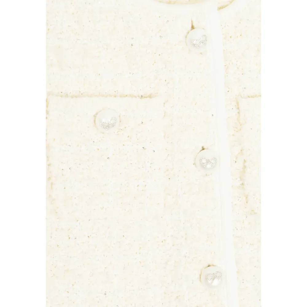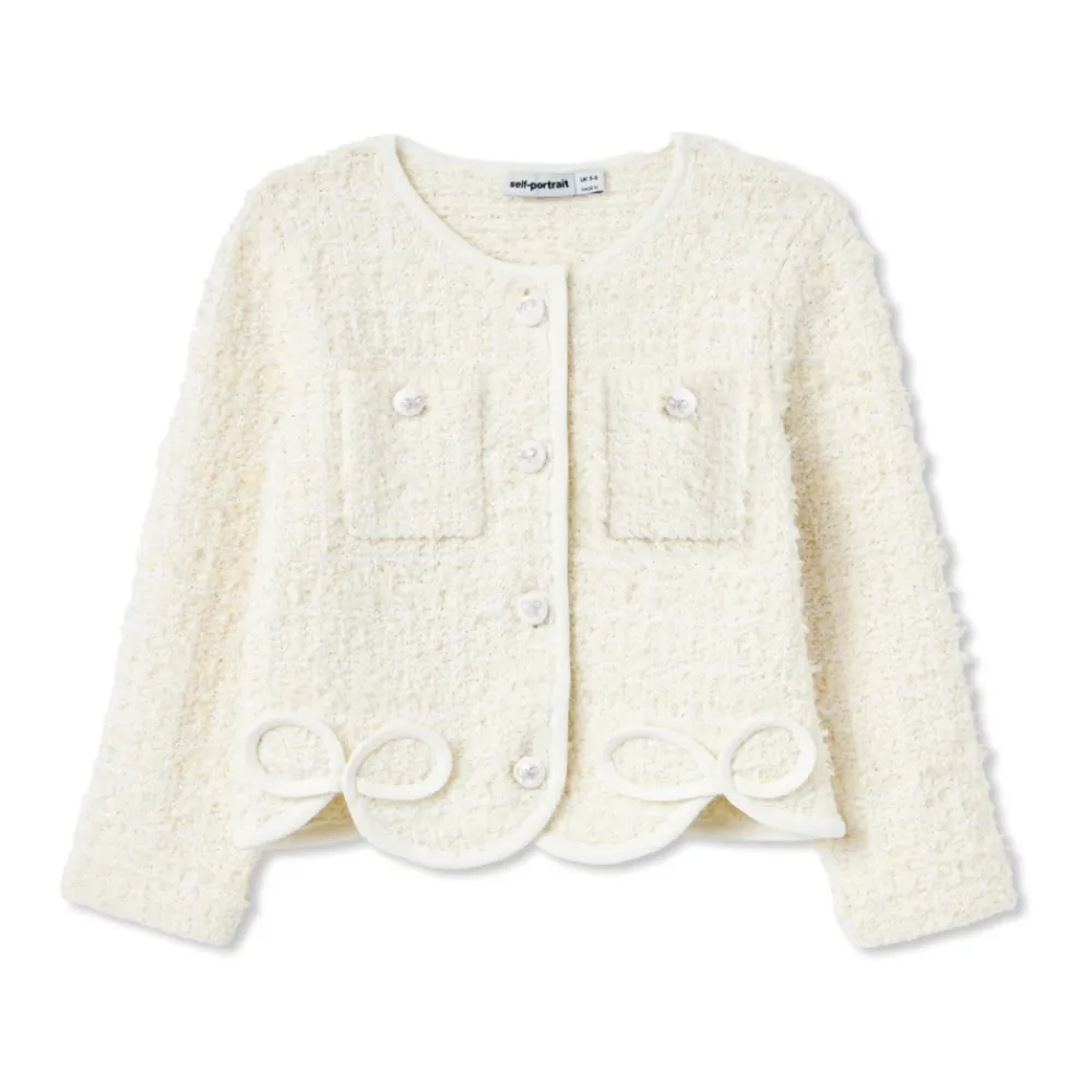 CARDIGAN MIT DEKORATIVEM FINISH von Self-Portrait Kids ist die Verkörperung raffinierter Eleganz, inspiriert von den höchsten Standards der weltweiten Kindermode. Der klassische, leicht kastige Schnitt betont subtil die Taille, während das taillenlange Design seinen zeitlosen Charakter unterstreicht. Der cremefarbene Bouclé-Strick mit einer markanten Textur verleiht dem Cardigan ein luxuriöses Aussehen. Der abgerundete Saum, der mit einer dekorativen Borte versehen ist, besticht durch seine Details, ebenso wie die beiden symmetrischen Brusttaschen, die mit eleganten Perlmutt-Knöpfen verschlossen sind. Die Einzigartigkeit dieses Stücks wird durch auffällige, bogenförmige Applikationen am unteren Rand und sorgfältige Verarbeitung weiter betont, was dieses Modell zu einer außergewöhnlichen Wahl für diejenigen macht, die anspruchsvollen Stil und unvergleichliche Qualität schätzen. WARUM SOLLTEN SIE DIESES PRODUKT KAUFEN? * Exklusives, sorgfältig ausgewähltes Strickmaterial mit luxuriöser Textur * Außergewöhnliche Verzierungen in Form von dekorativen Schleifen * Makellose Verarbeitung, charakteristisch für die besten Designer * Funktionale Brusttaschen mit dekorativen Knöpfen * Unterscheidender, eleganter Schnitt, der Ihren Stil unterstreicht